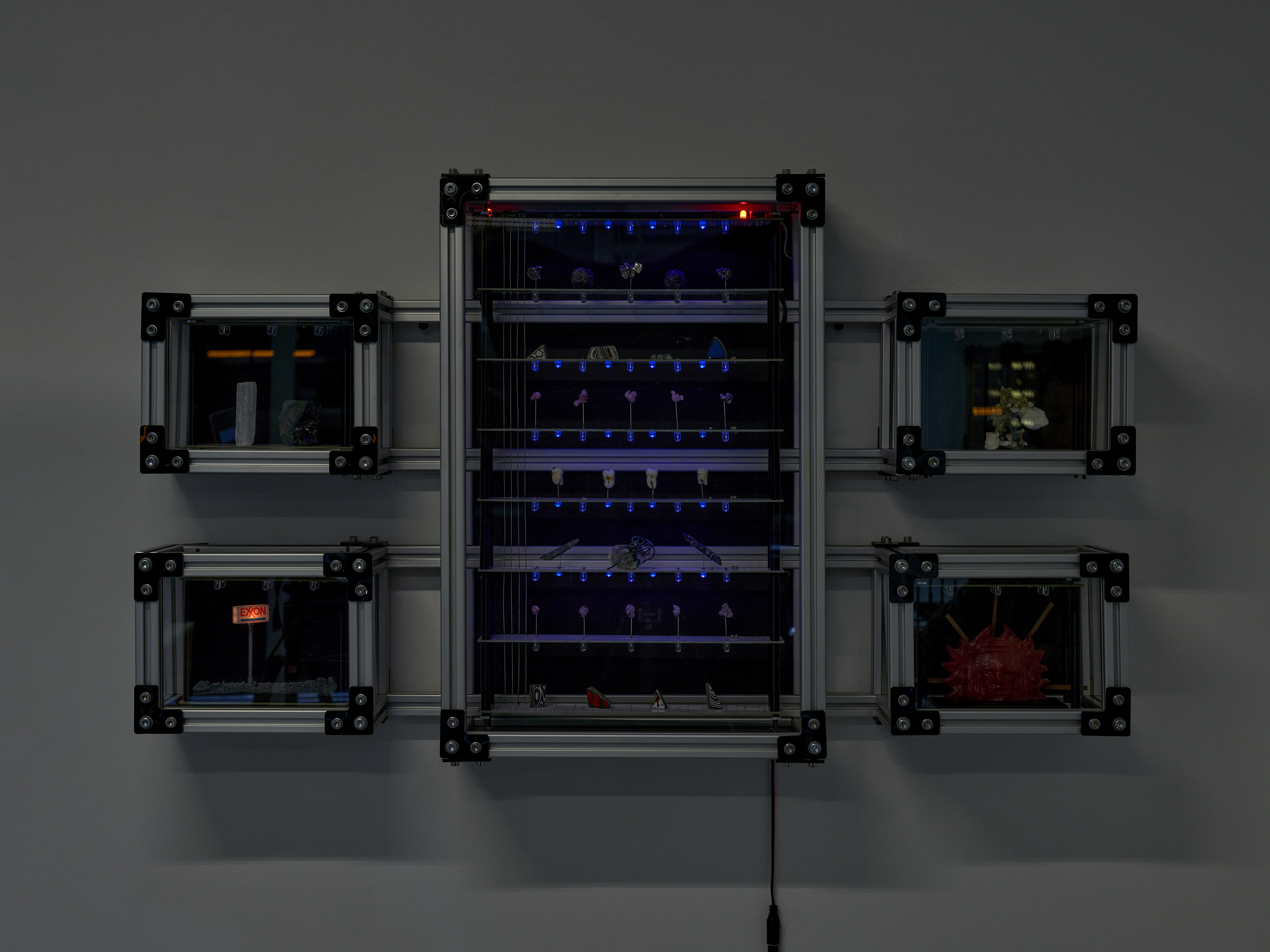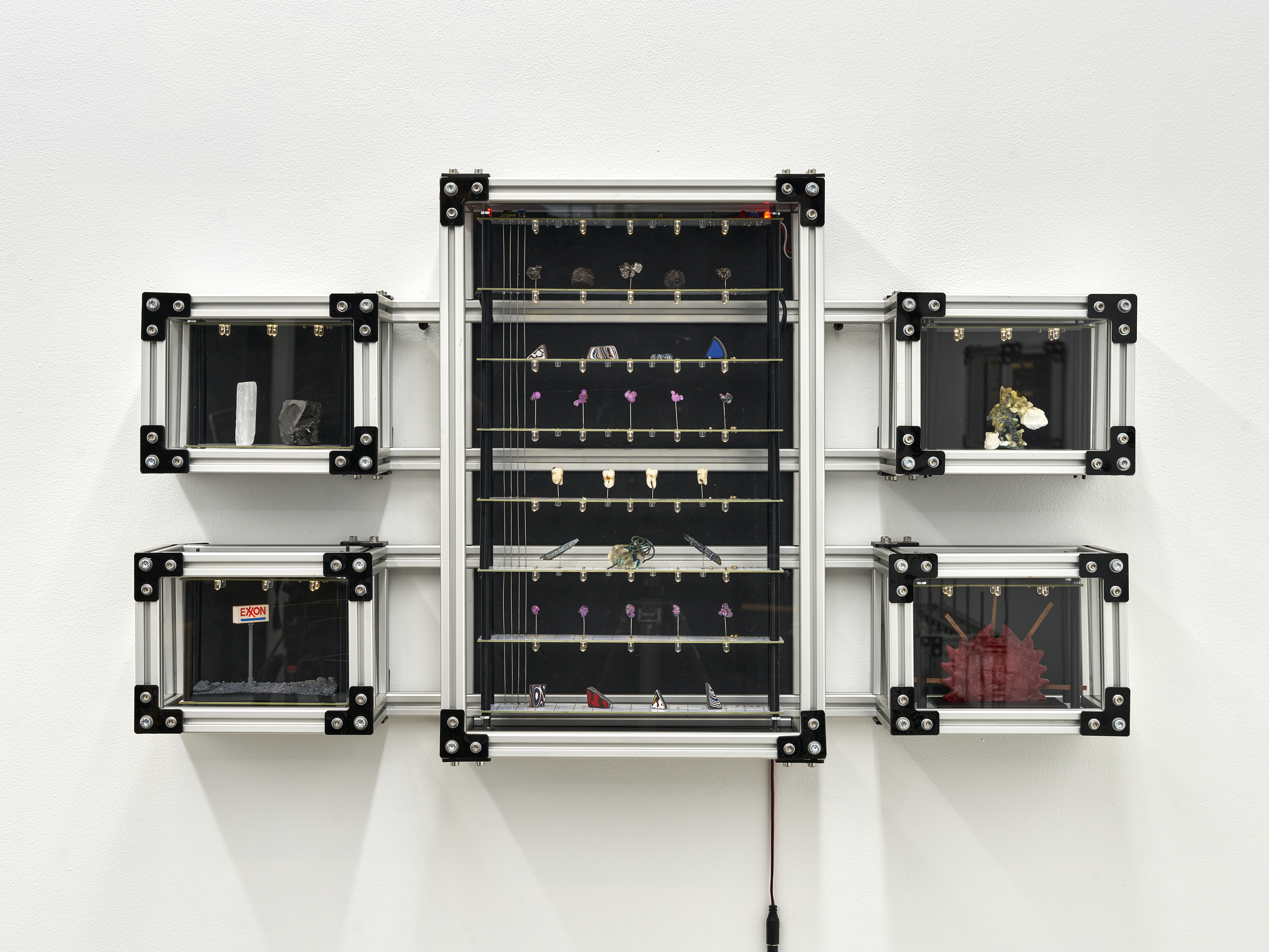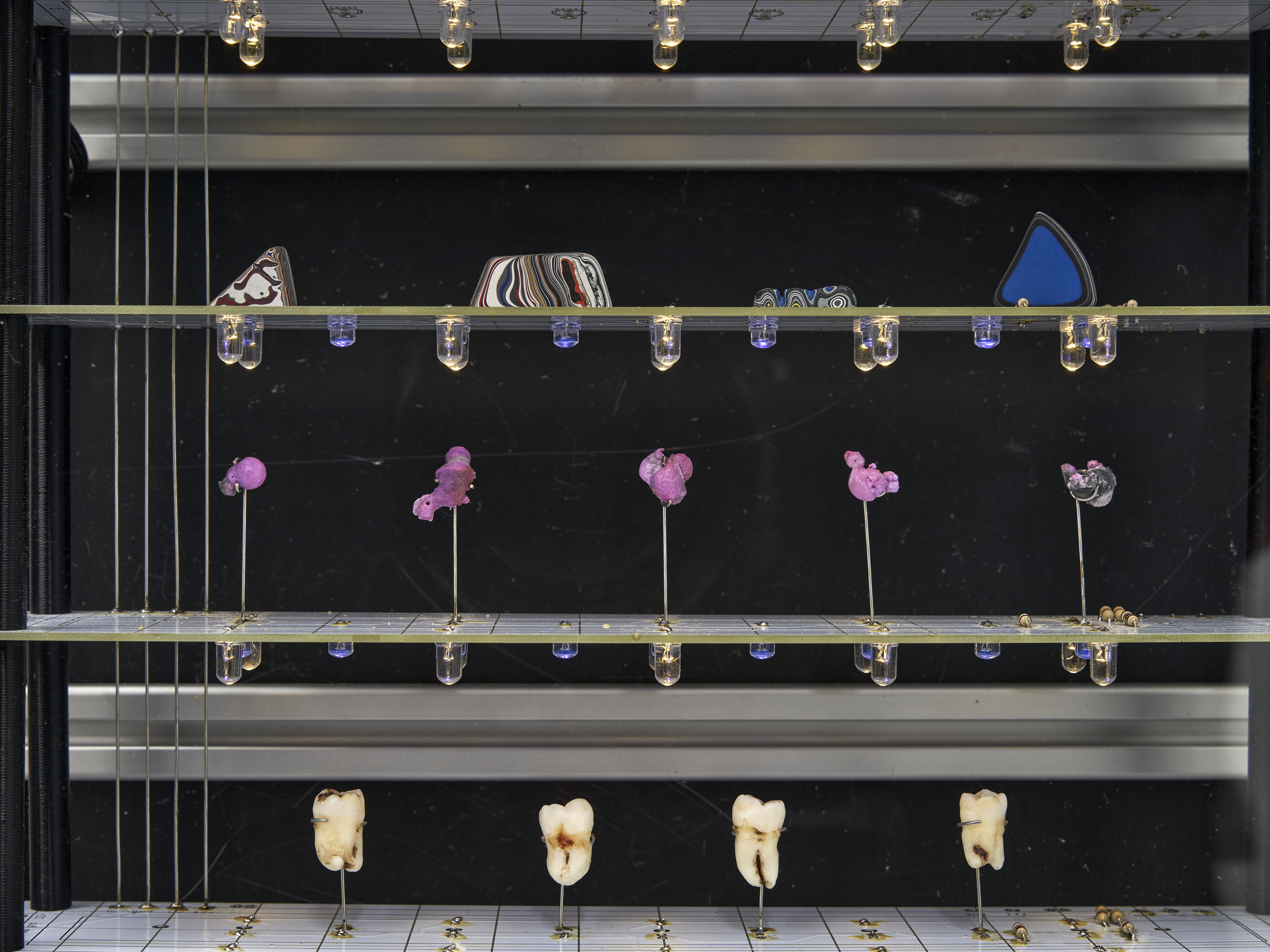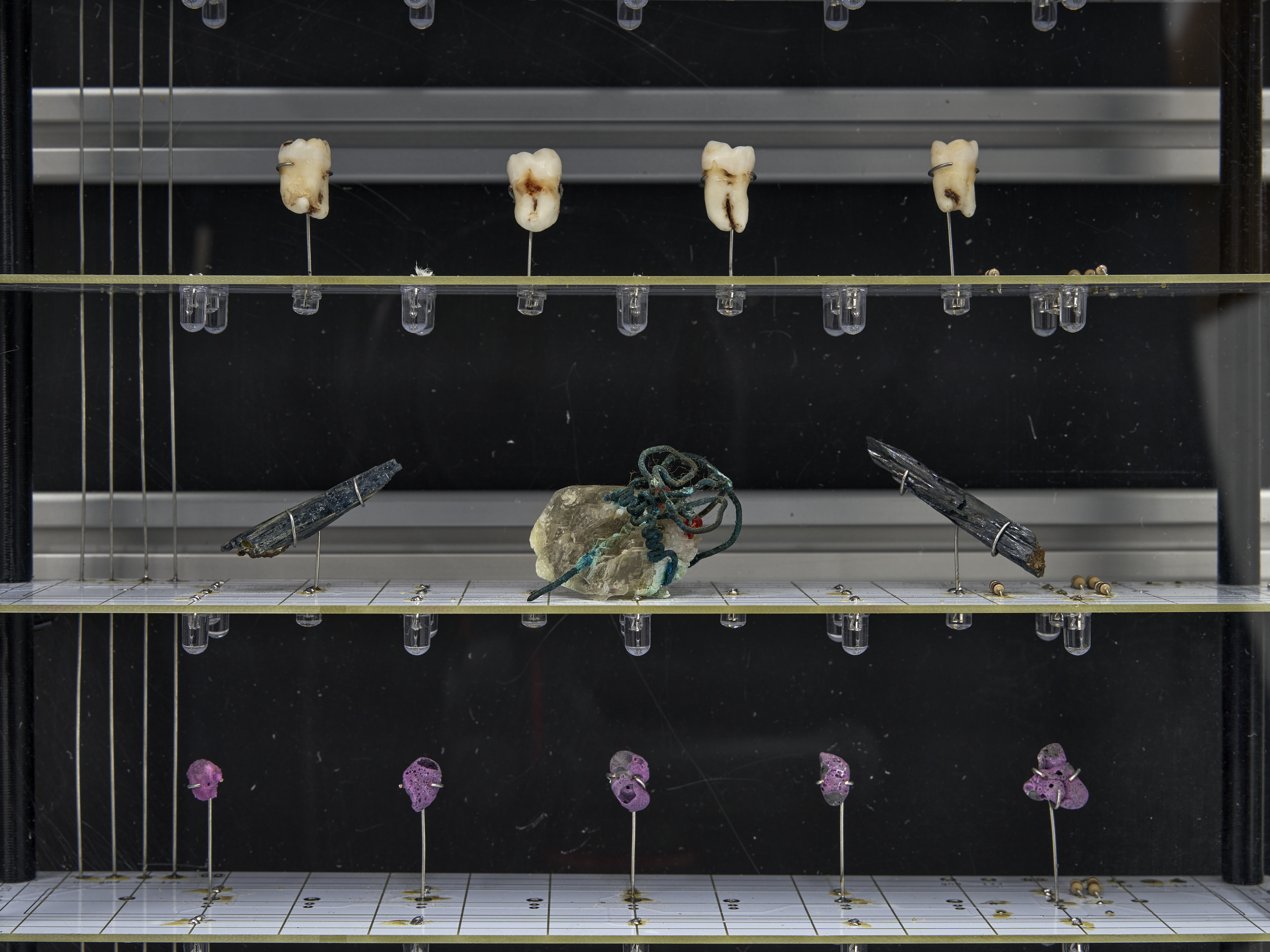 Materials: A wall mounted display case containing: ten homemade rubies, four wisdom teeth (courtesy of the artist), two shards of vivianite (sourced from a seller in Brazil who claims these were “hand selected from a graveyard”), a sculpture depicting a skull made of 20 AWG copper wire encased in a piezoelectric crystal (also known as Rochelle Salt or potassium sodium tartrate, characterized by their pyroelectricity property in which these growths can generate a temporary voltage when heated, cooled, or experience mechanical pressure), eight chunks of fordite (also known as Detroit Agate or Motor City Agate (which are formed from the buildup of thousands of layers of automotive paint slag on tracks and skids in auto plants) carved and tumbled into minimalist shapes, three Campo del Cielo meteorite fragments, two Prophecy Pseudomorphs (made up of hematite, whose name is derived from the Greek word for “blood”), a chunk of shungite and the selenite wand that protected its passage to the artist, a plastic army man in the throngs of a violent act cast in piezoelectric crystals (see above note), a small totem made of wax from dozens of Babybel 8.5oz cheese snack collected during (to be cast in zinc plated copper legs of every component clipped onto the floor of the artists studio between 2020 and 2024)