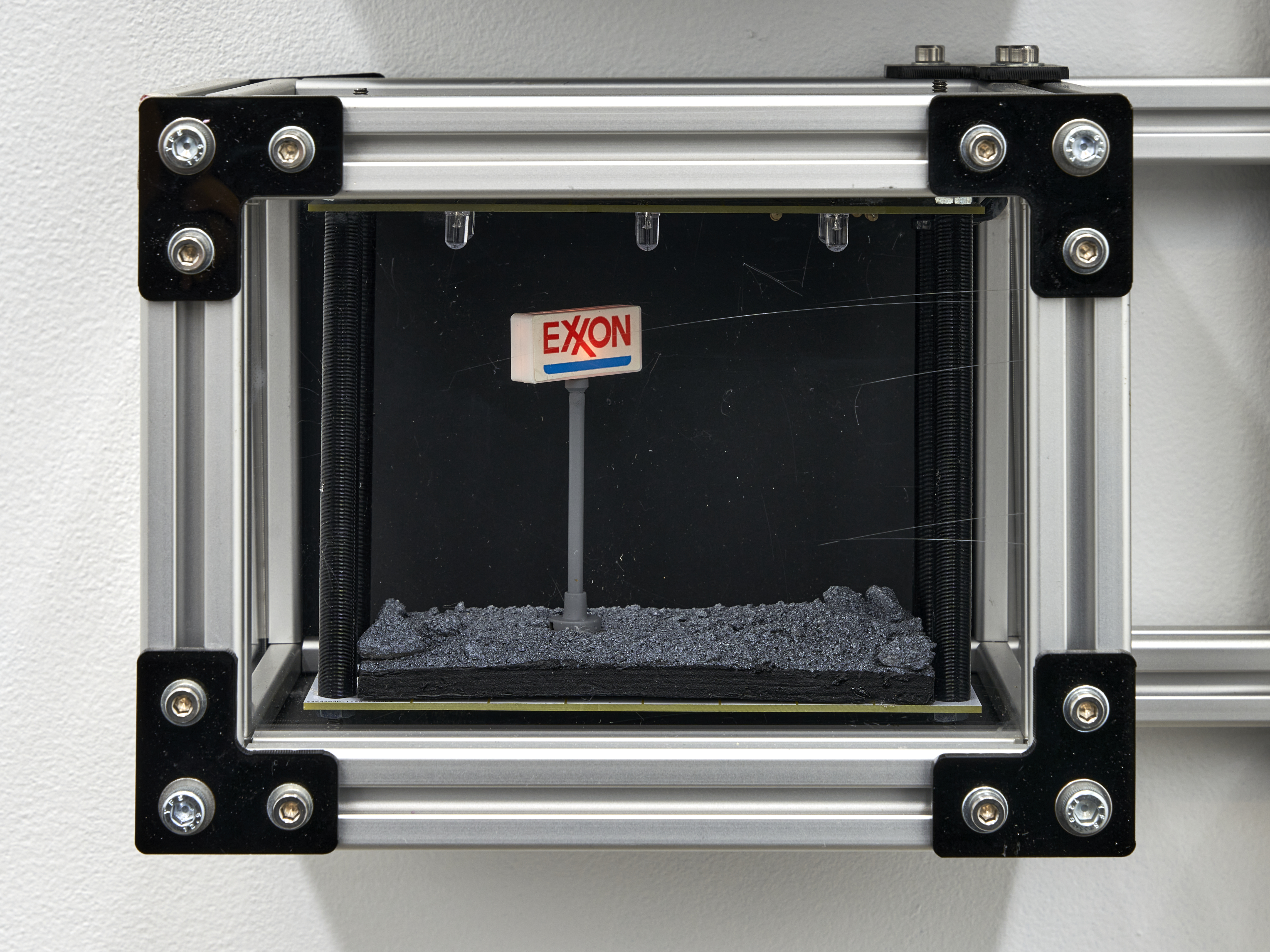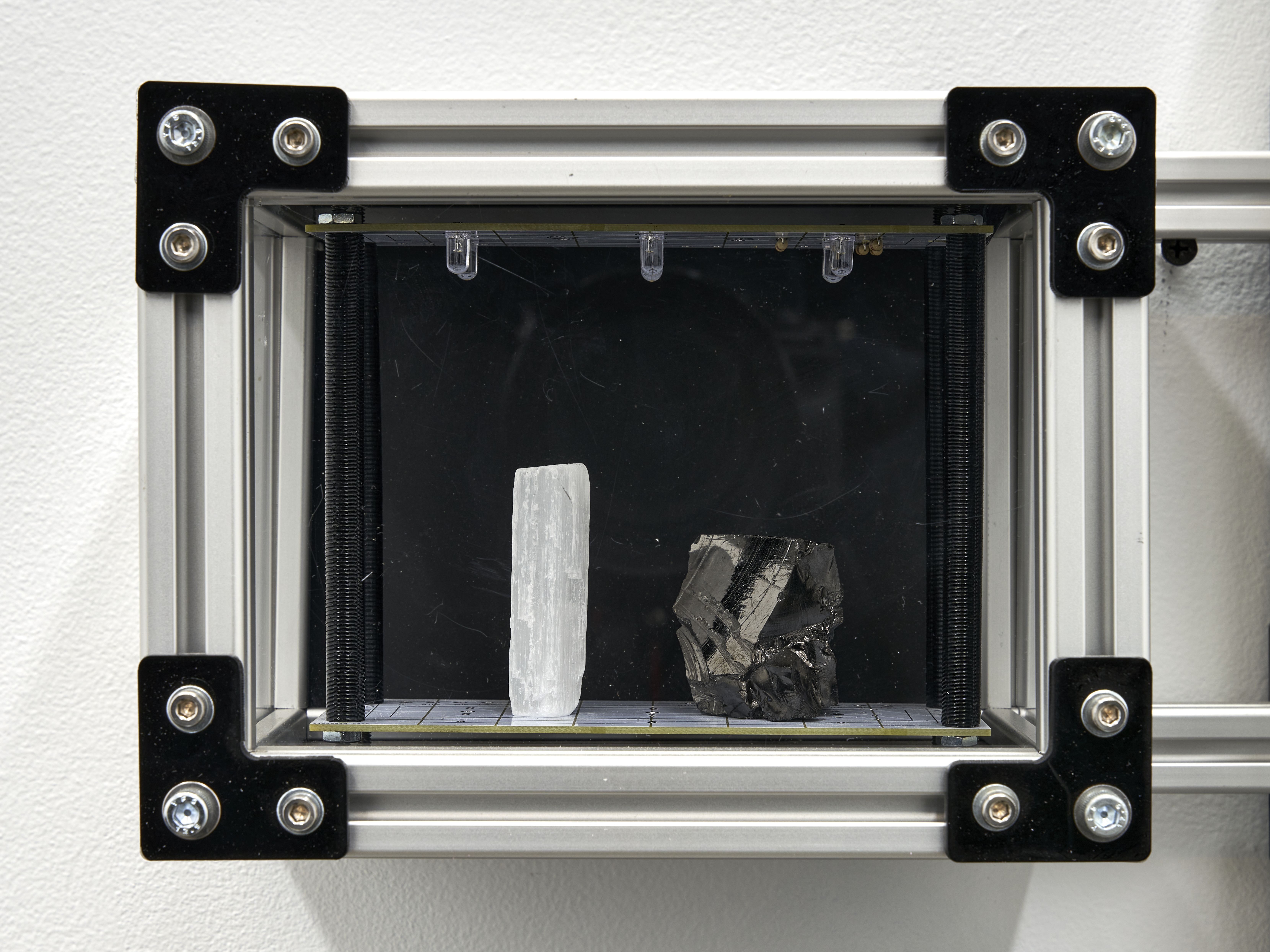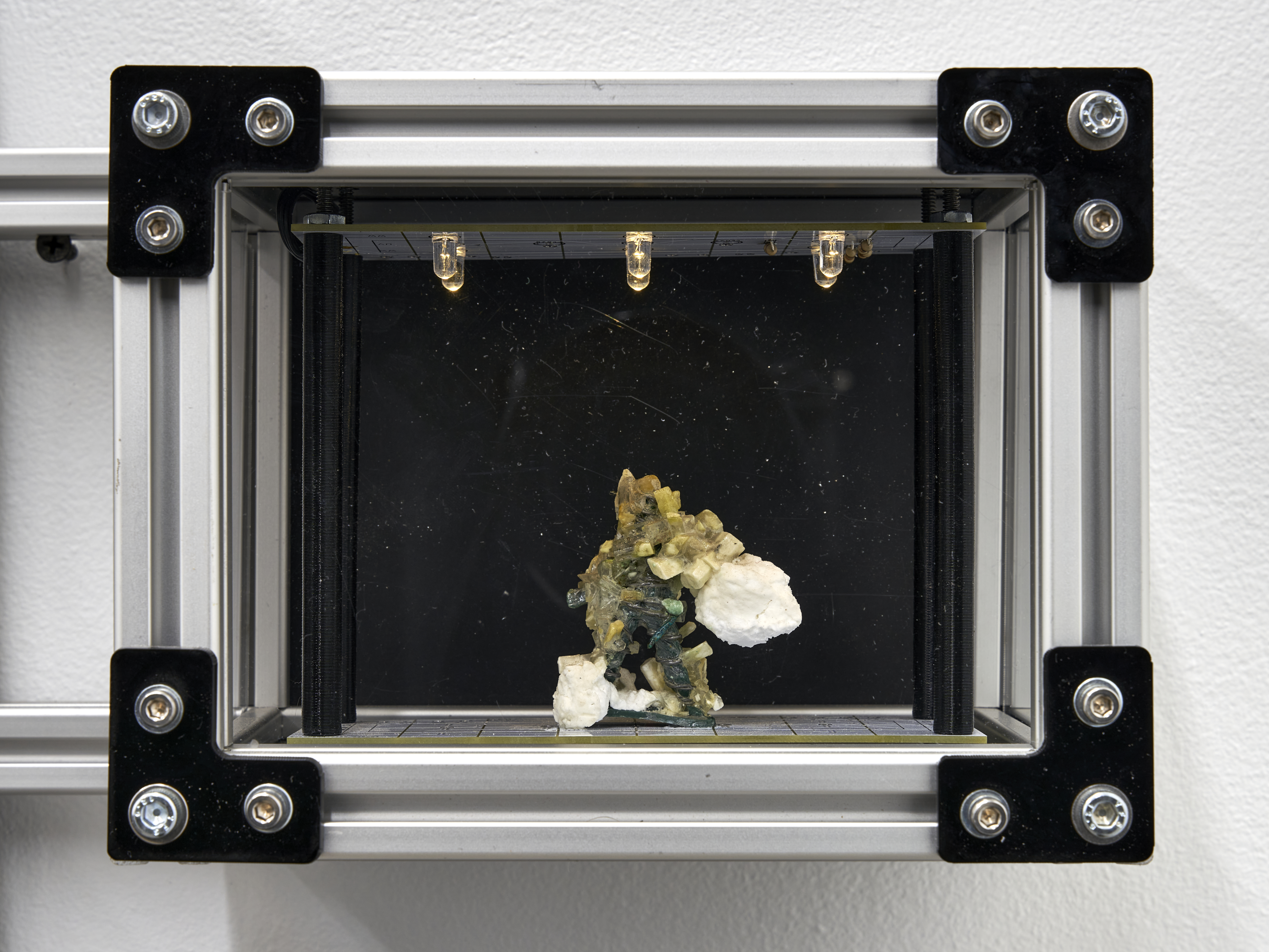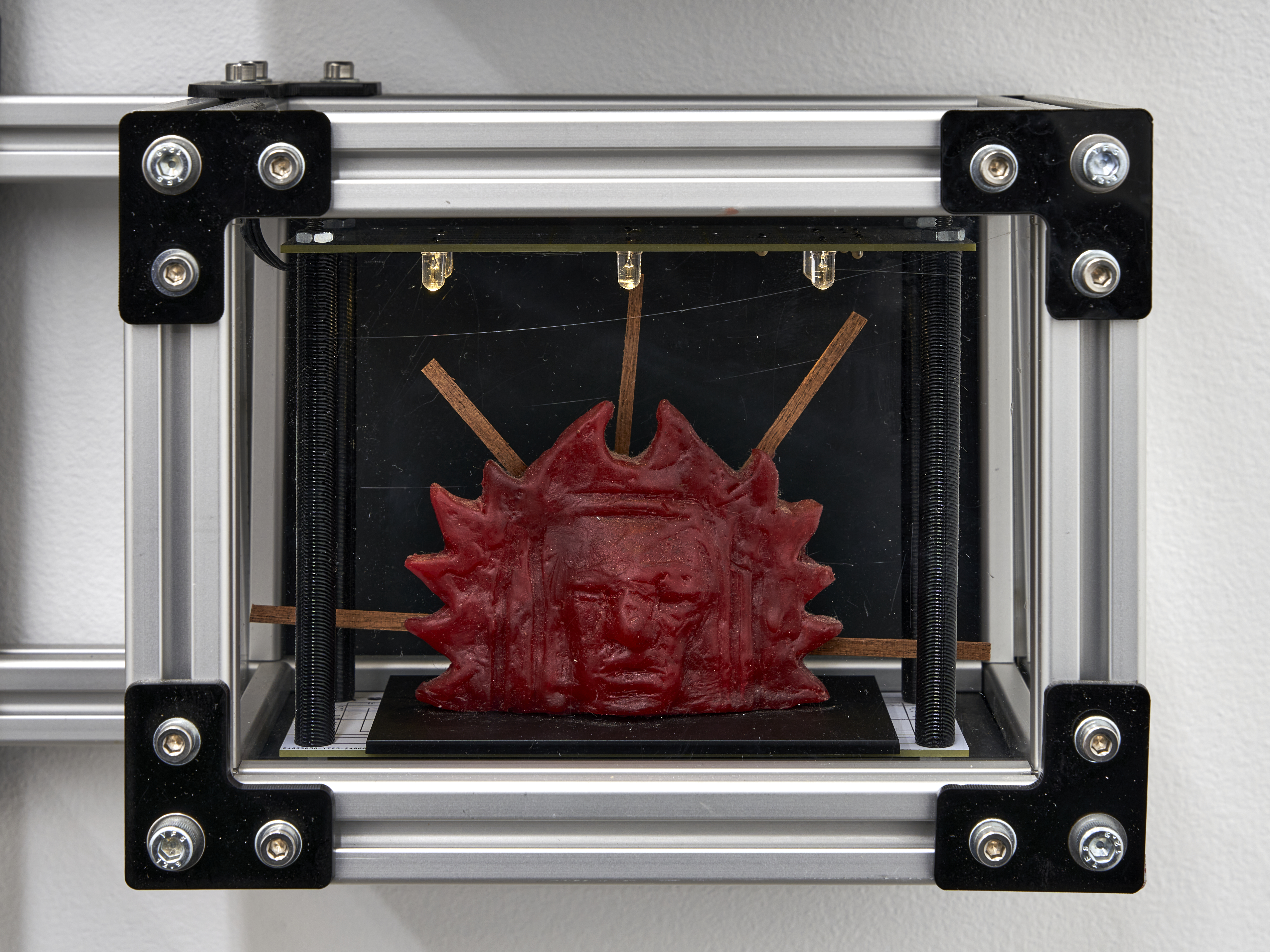 Materials: A wall mounted display case containing: ten homemade rubies, four wisdom teeth (courtesy of the artist), two shards of vivianite (sourced from a seller in Brazil who claims these were “hand selected from a graveyard”), a sculpture depicting a skull made of 20 AWG copper wire encased in a piezoelectric crystal (also known as Rochelle Salt or potassium sodium tartrate, characterized by their pyroelectricity property in which these growths can generate a temporary voltage when heated, cooled, or experience mechanical pressure), eight chunks of fordite (also known as Detroit Agate or Motor City Agate (which are formed from the buildup of thousands of layers of automotive paint slag on tracks and skids in auto plants) carved and tumbled into minimalist shapes, three Campo del Cielo meteorite fragments, two Prophecy Pseudomorphs (made up of hematite, whose name is derived from the Greek word for “blood”), a chunk of shungite and the selenite wand that protected its passage to the artist, a plastic army man in the throngs of a violent act cast in piezoelectric crystals (see above note), a small totem made of wax from dozens of Babybel 8.5oz cheese snack collected during (to be cast in zinc plated copper legs of every component clipped onto the floor of the artists studio between 2020 and 2024)