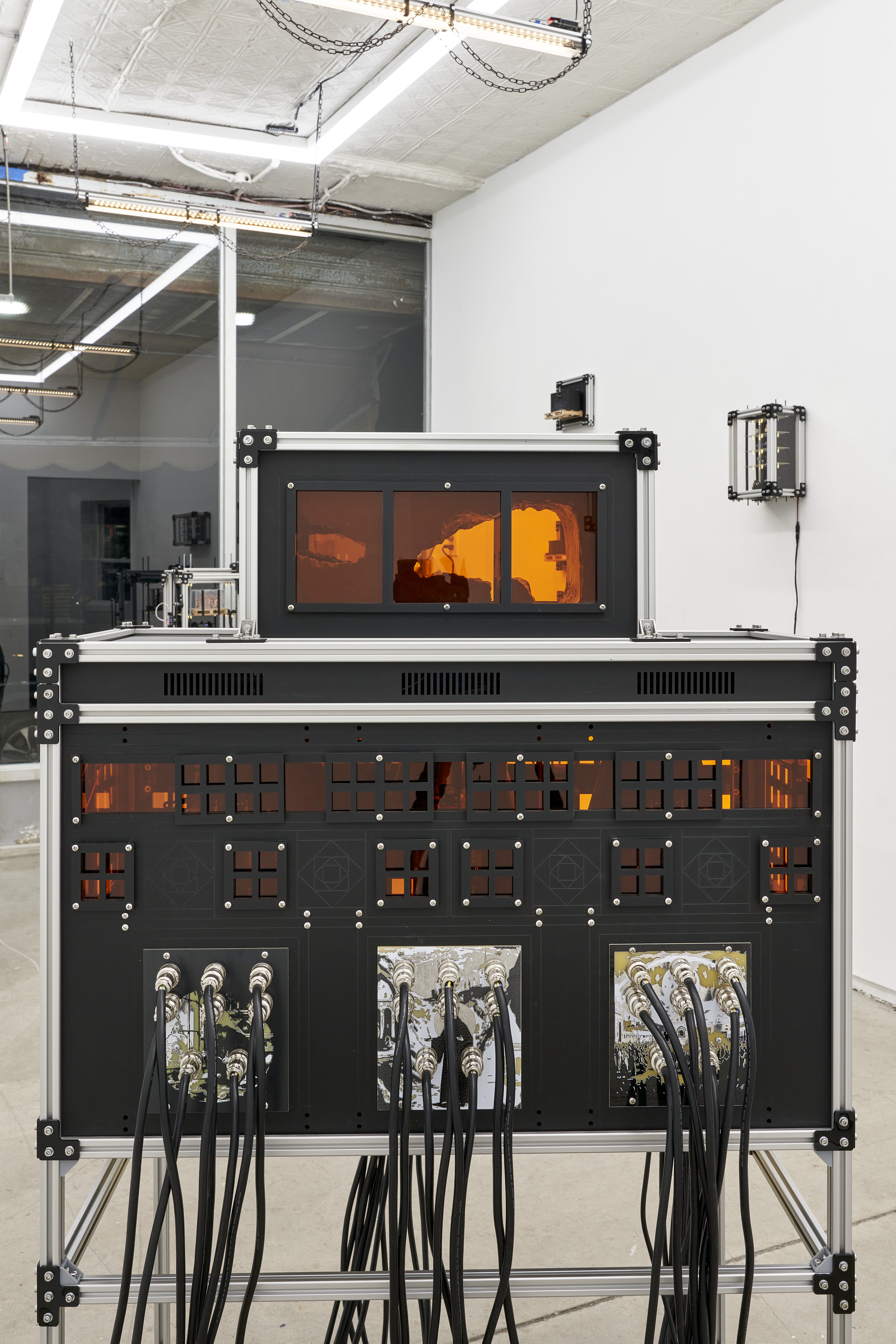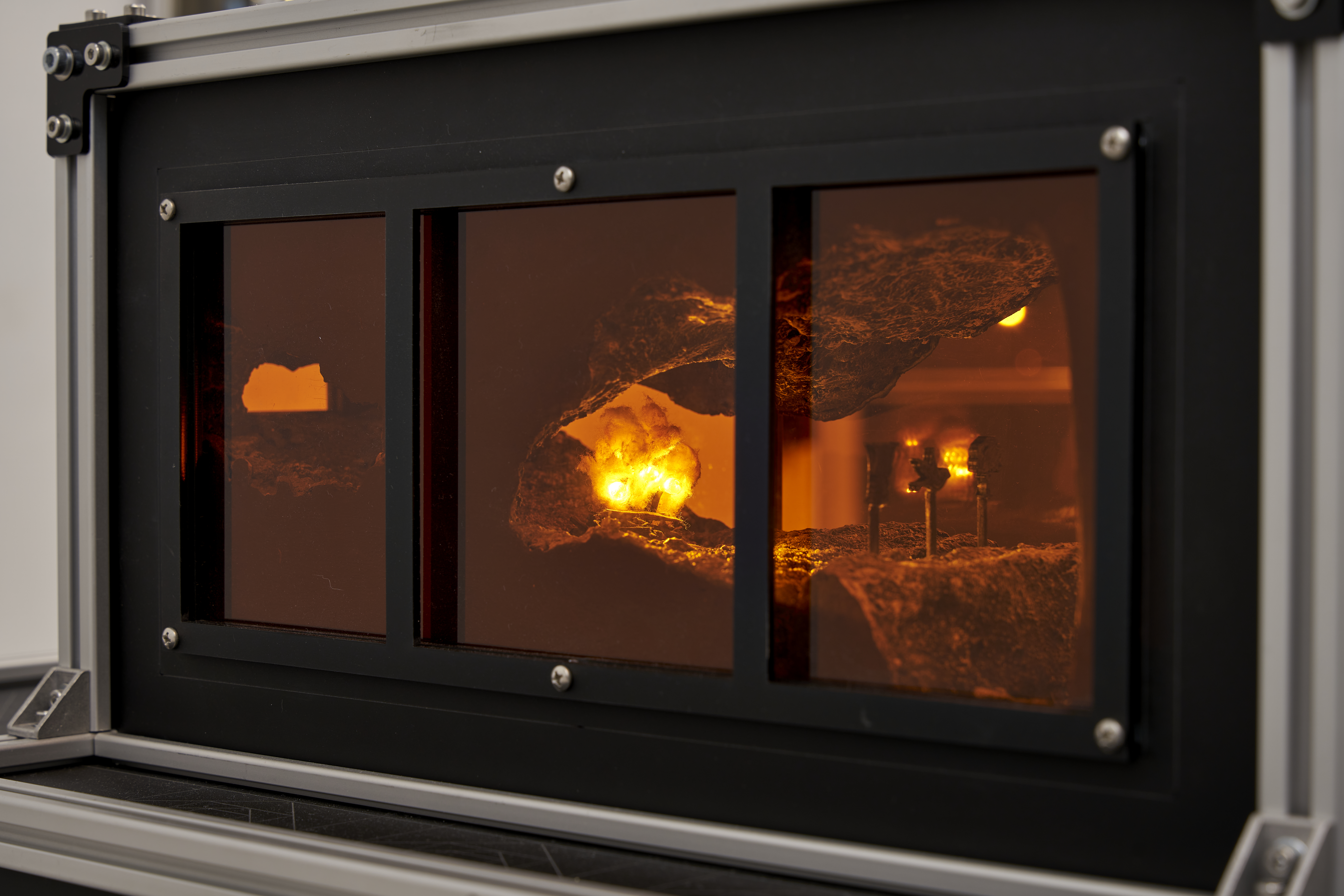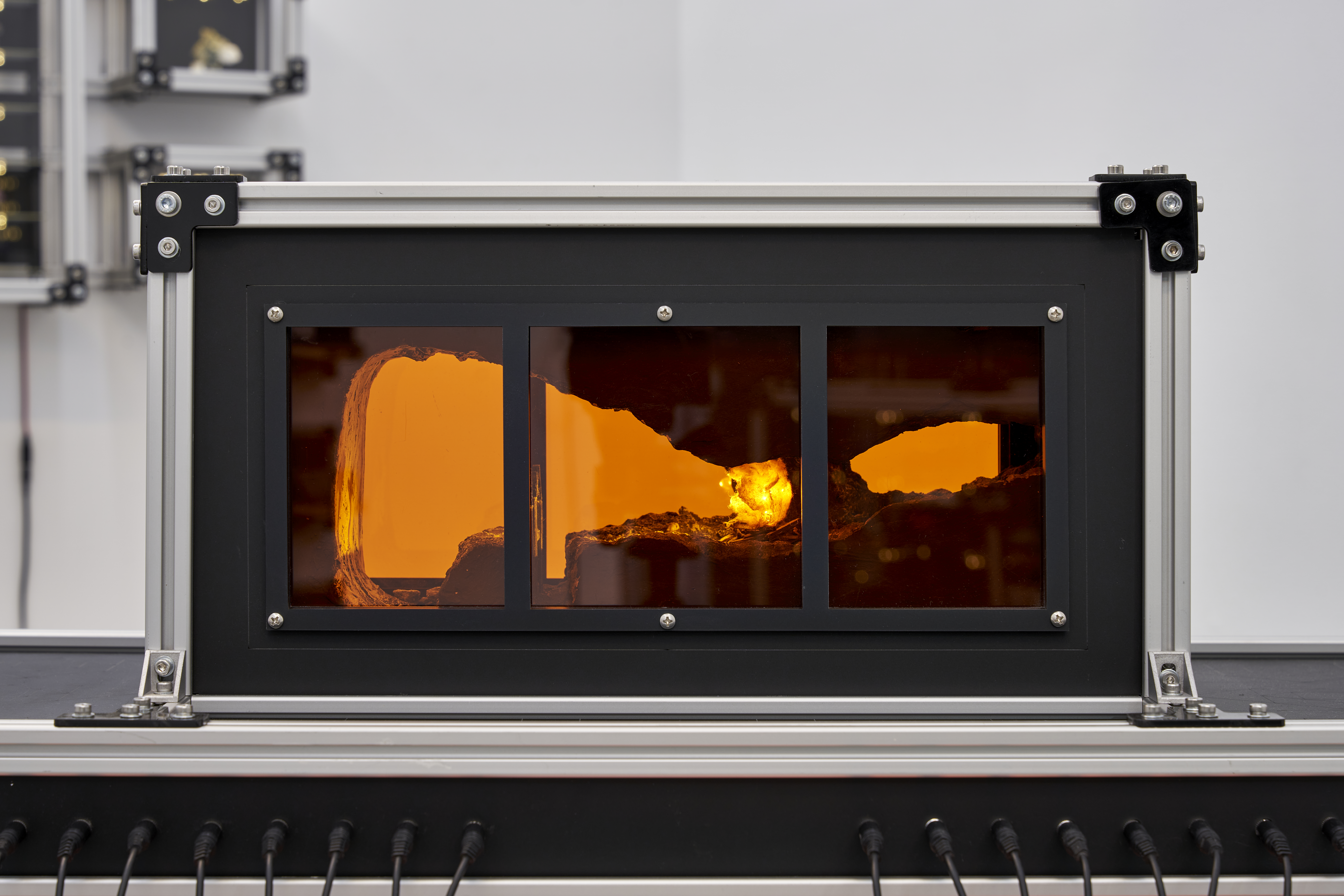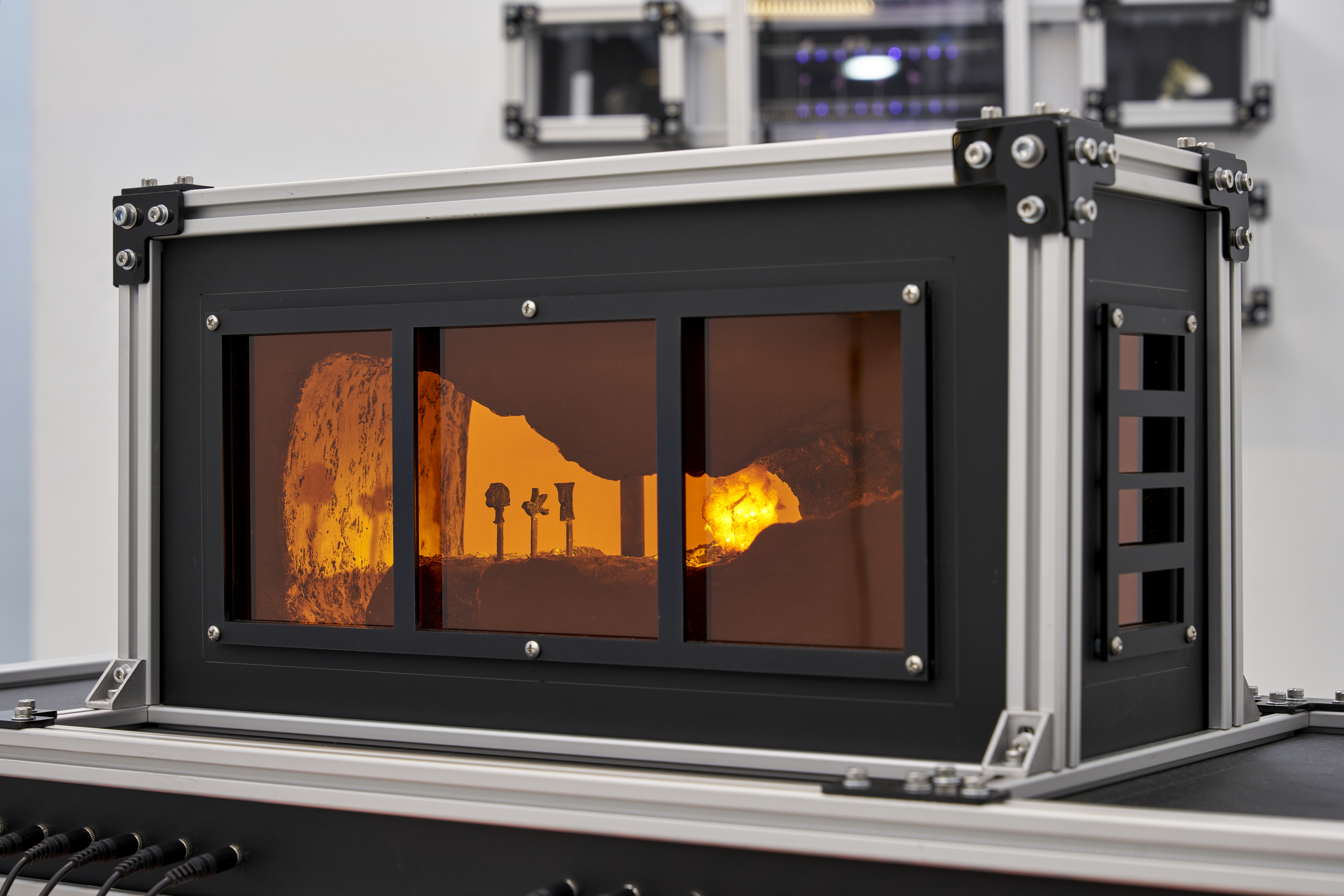 Material: aluminum extrusion, laser cut acrylic, misc hardware, three lava lamps, 3d printed PLA, motors, timing belts, computer fans, custom electronics, cables, plaster, foam, balsa wood, cotton ball, paint, pla plastic, various stones, sand
