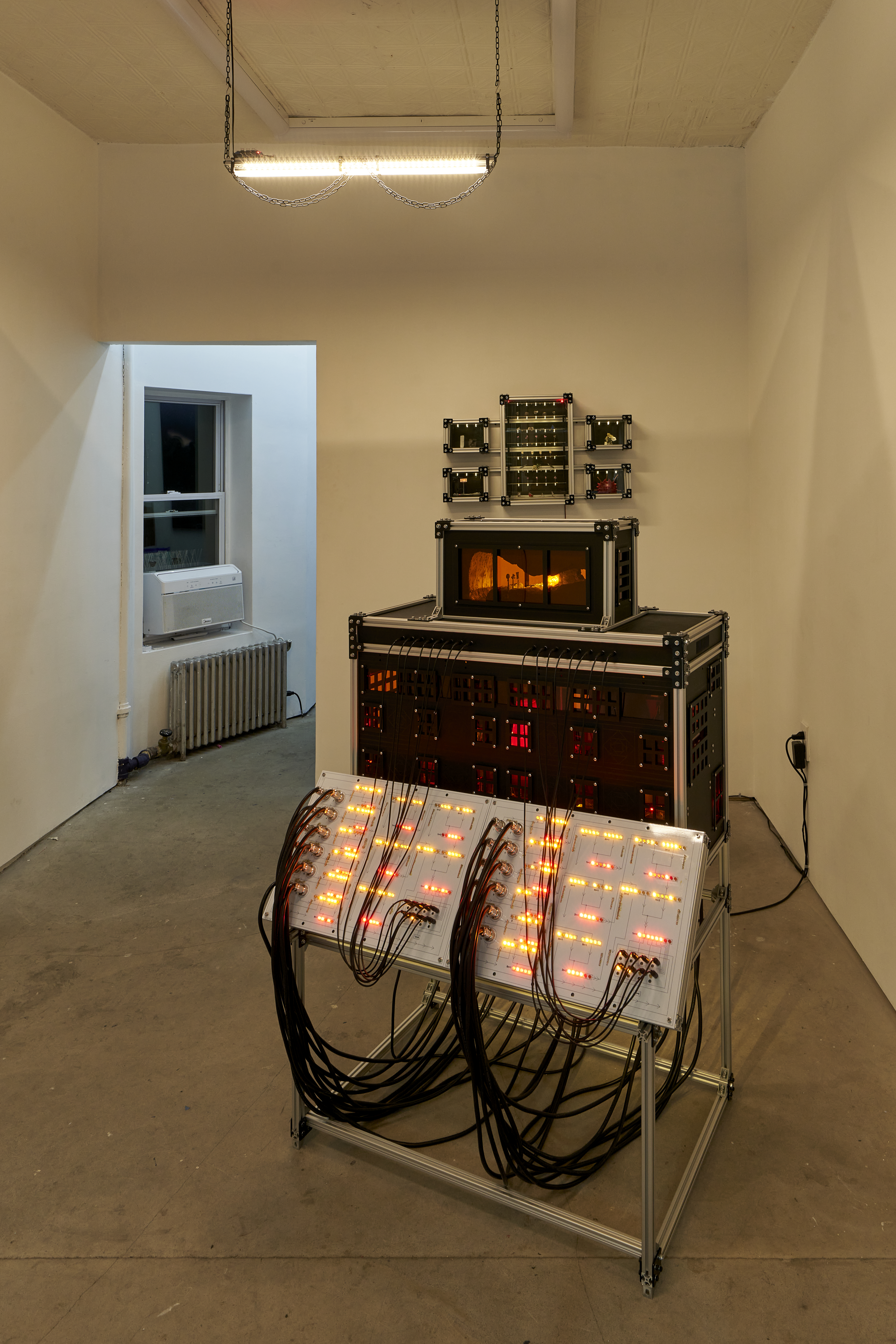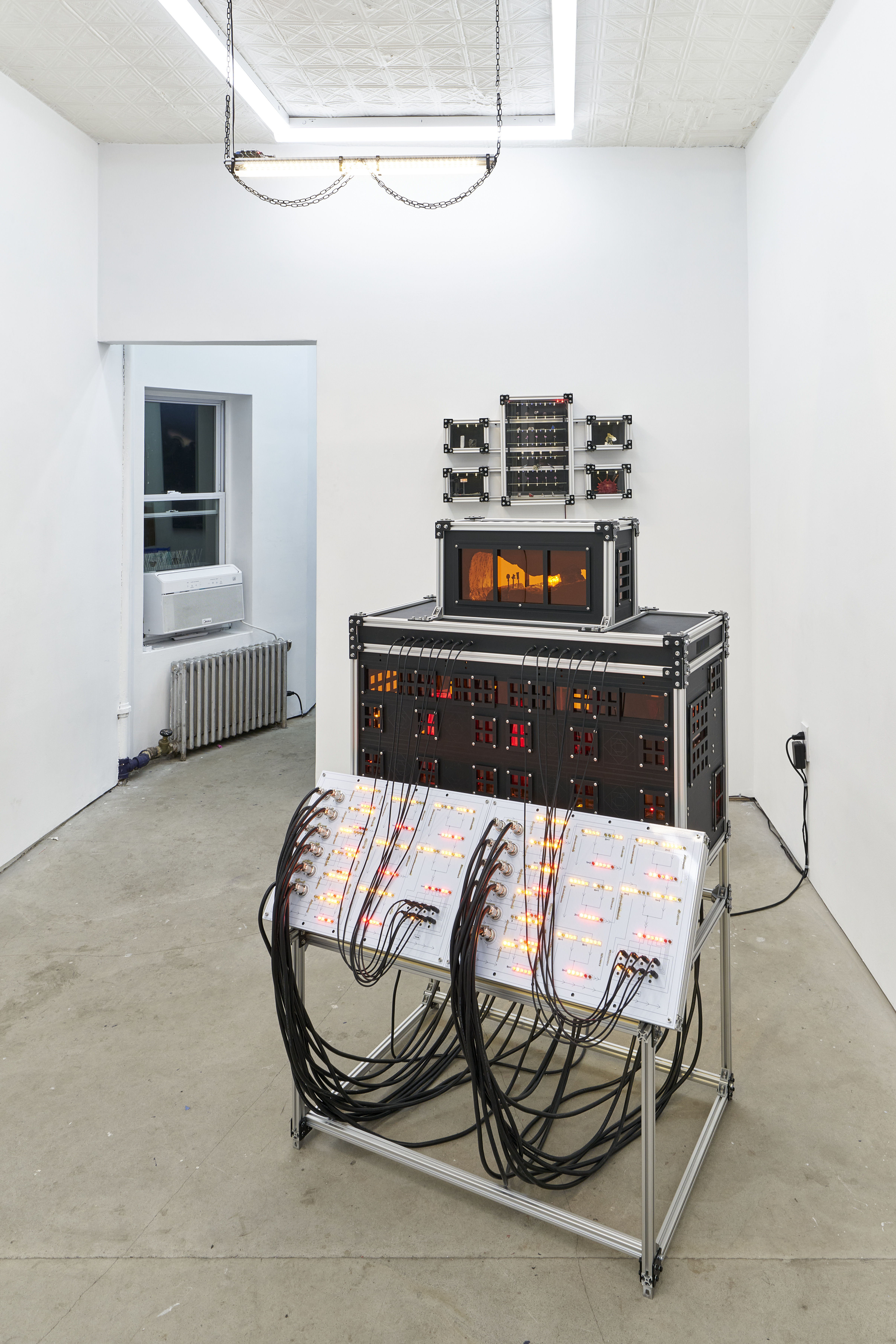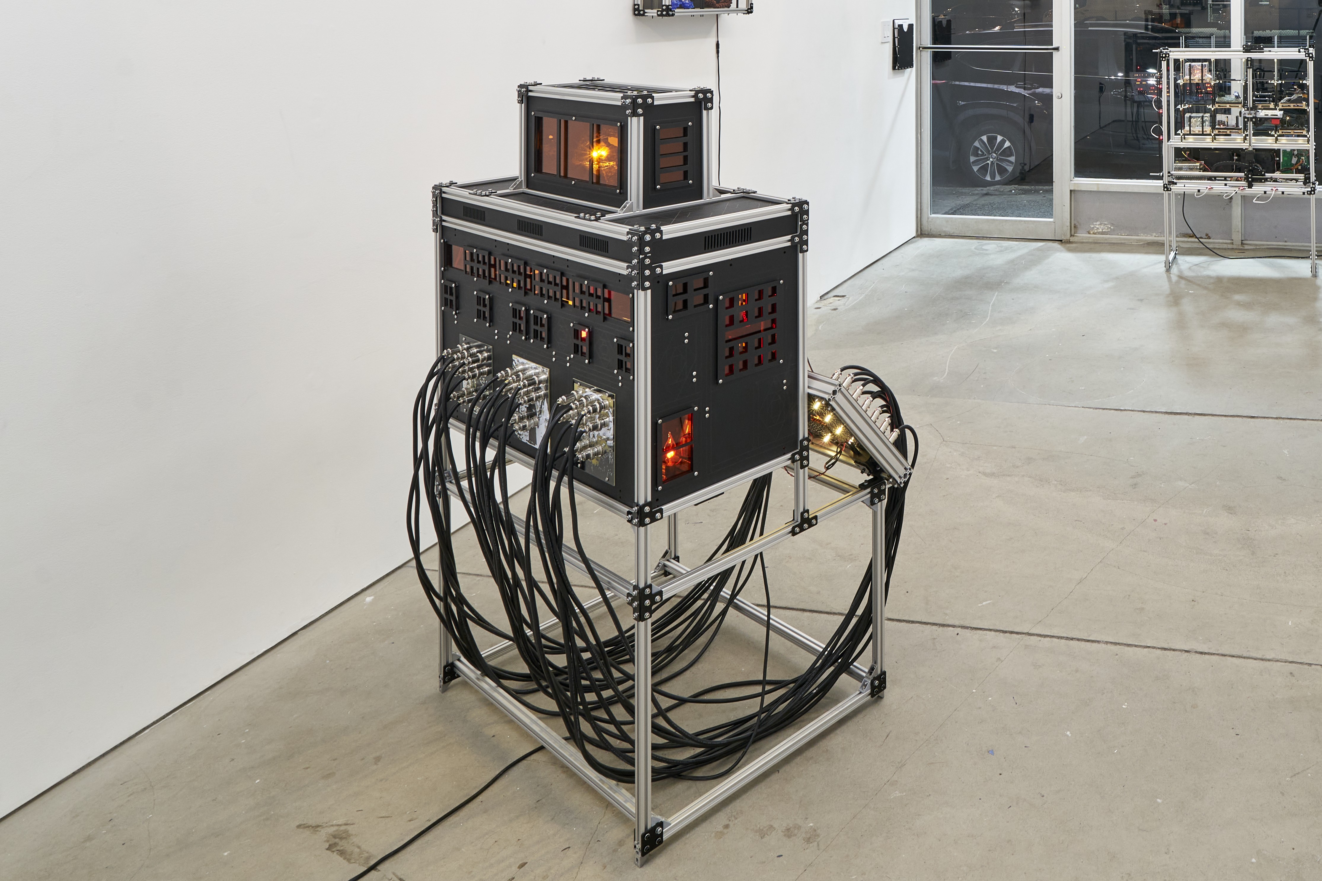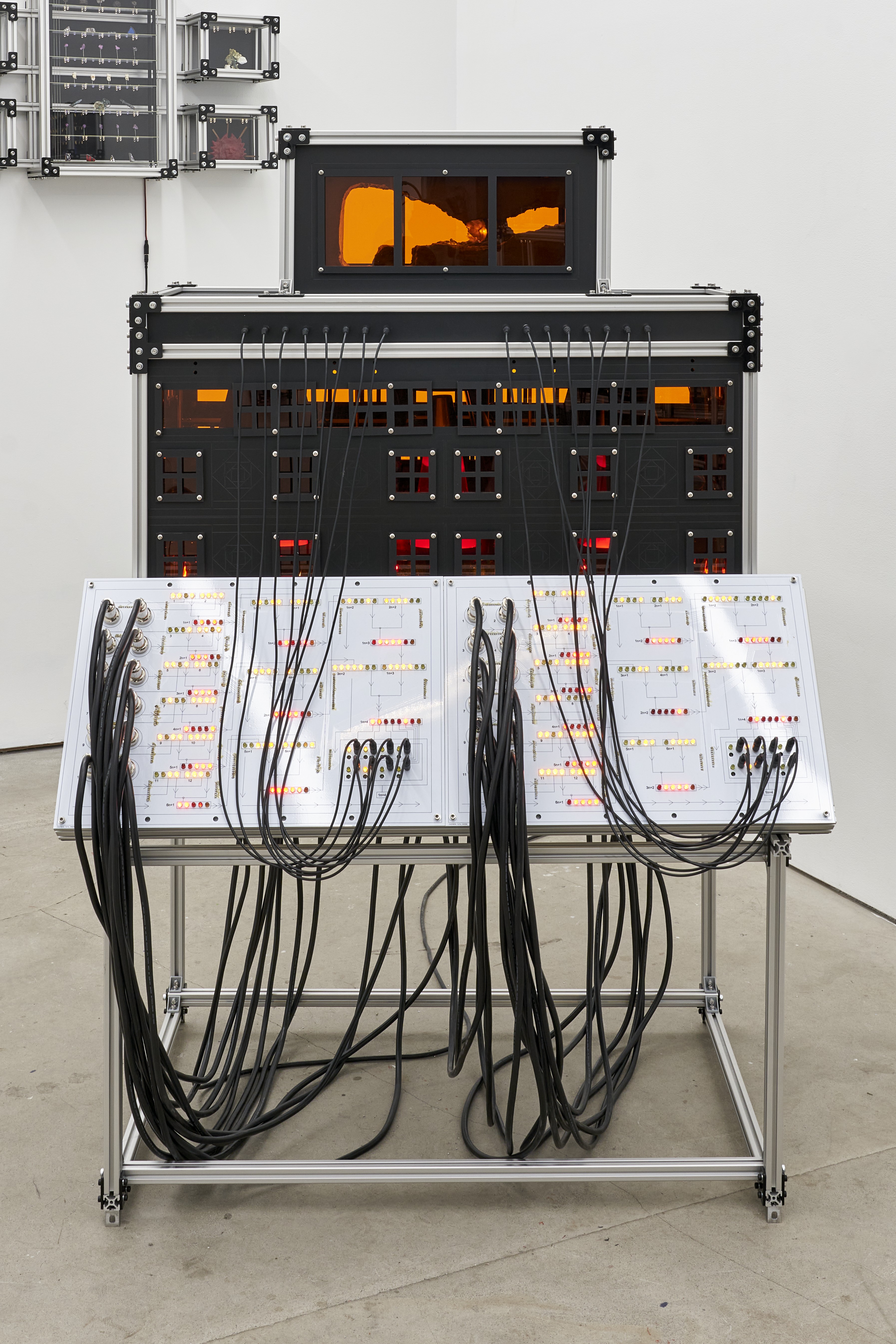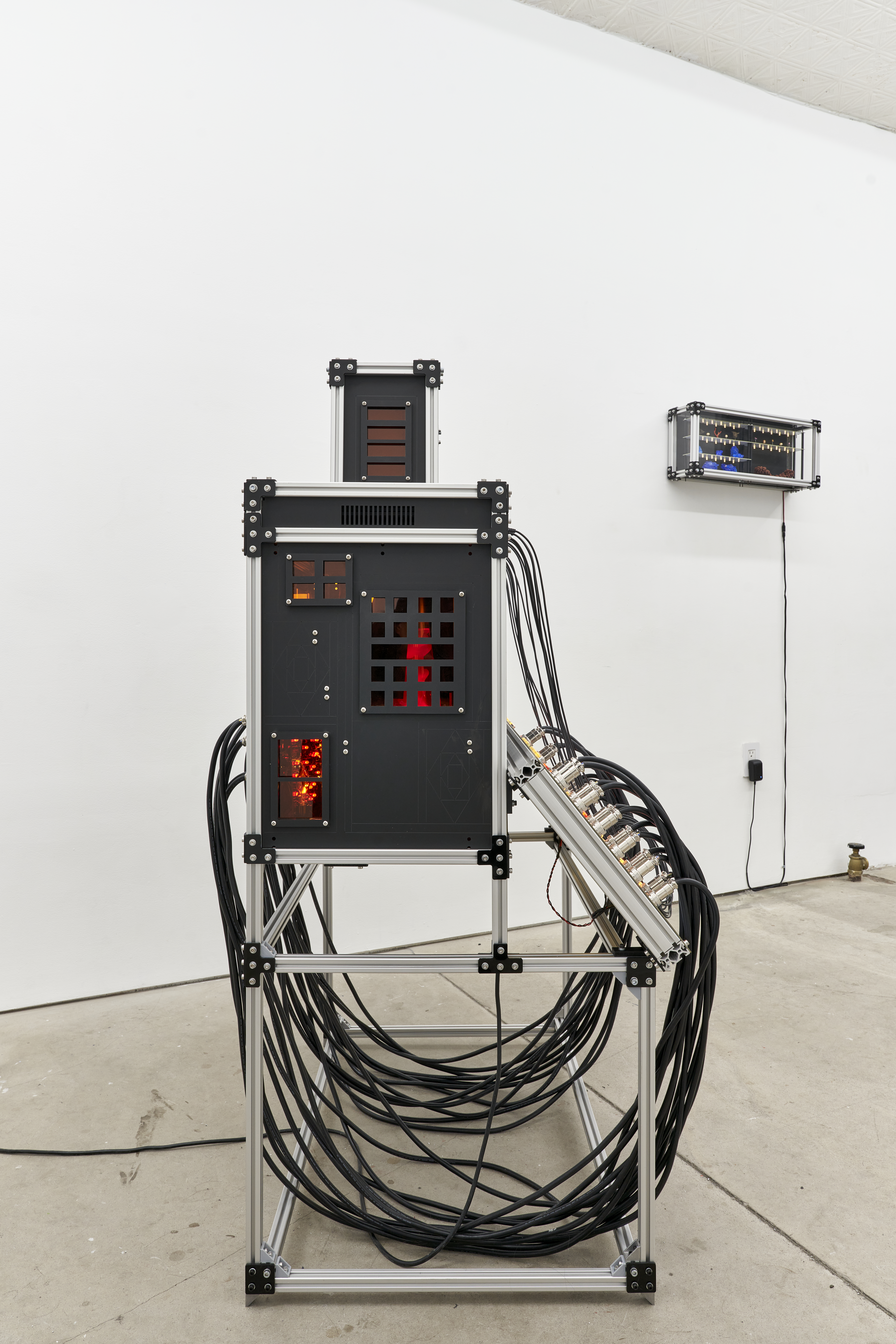 Material: aluminum extrusion, laser cut acrylic, misc hardware, three lava lamps, 3d printed PLA, motors, timing belts, computer fans, custom electronics, cables, plaster, foam, balsa wood, cotton ball, paint, pla plastic, various stones, sand