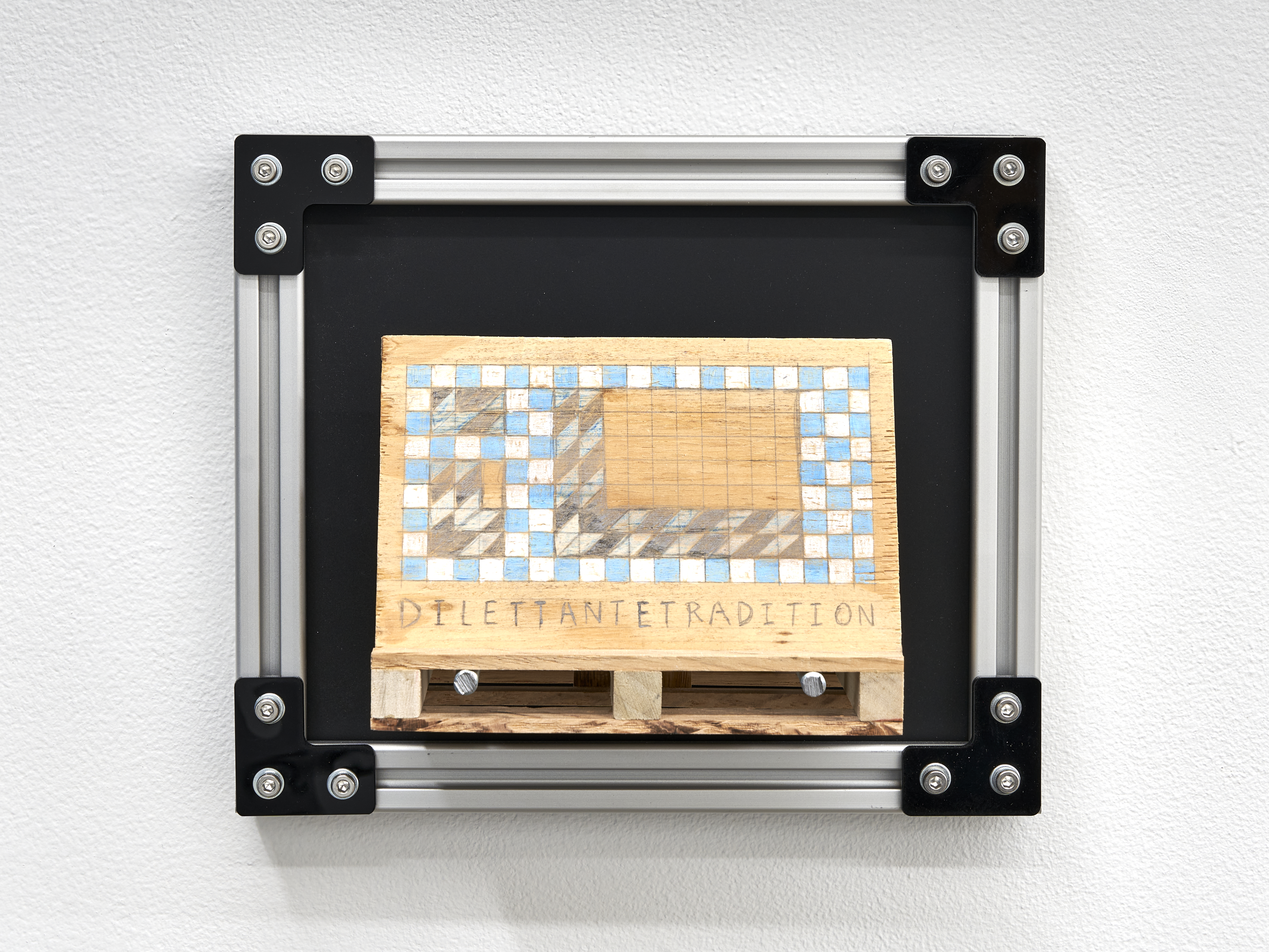 Material: oak pallet, acrylic box containing a bladeless knife with no handle