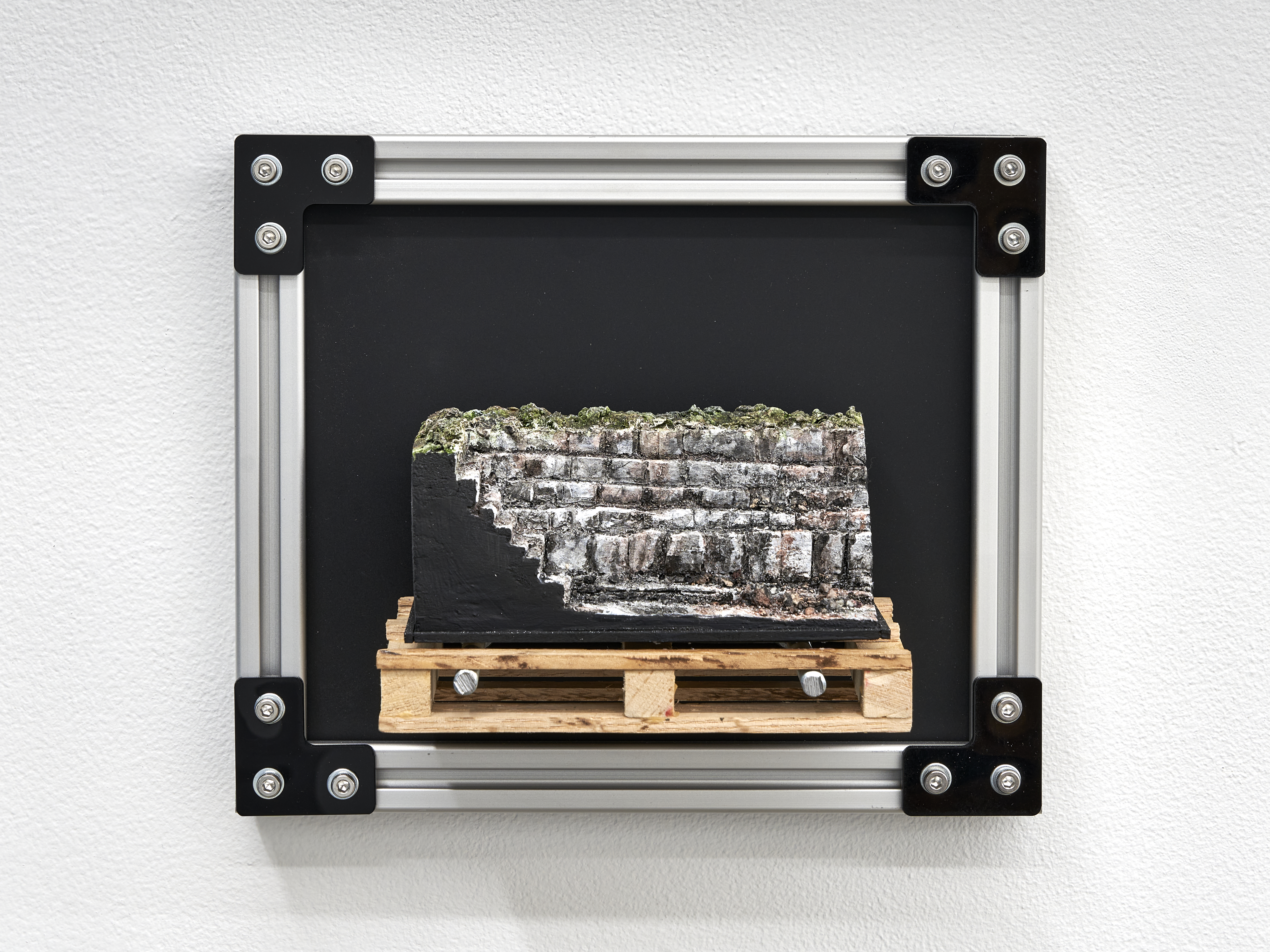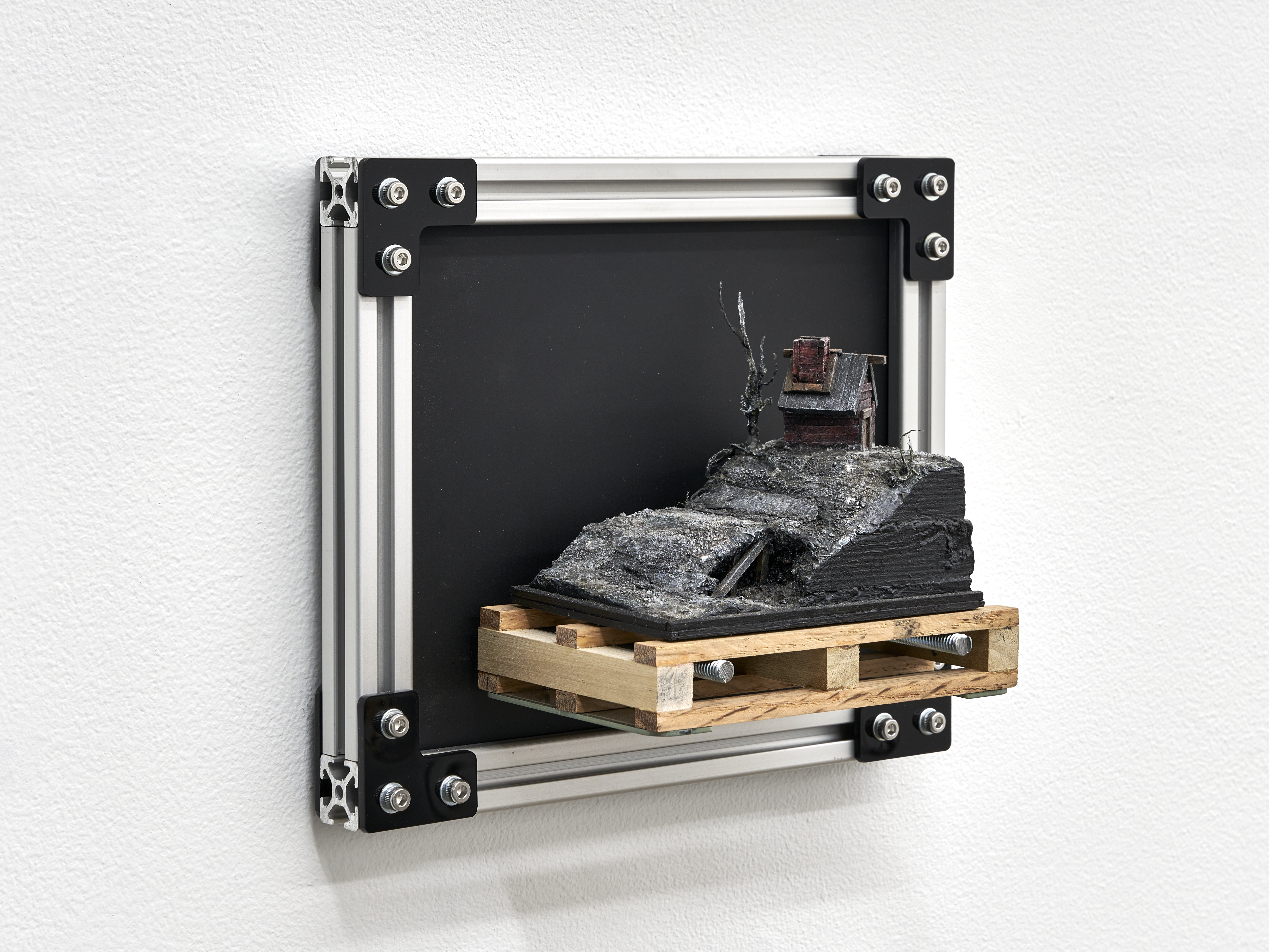 Material: oak pallet, foam, paint, wood, custom printed circuit boards and electronics, sand, plaster, flocking material