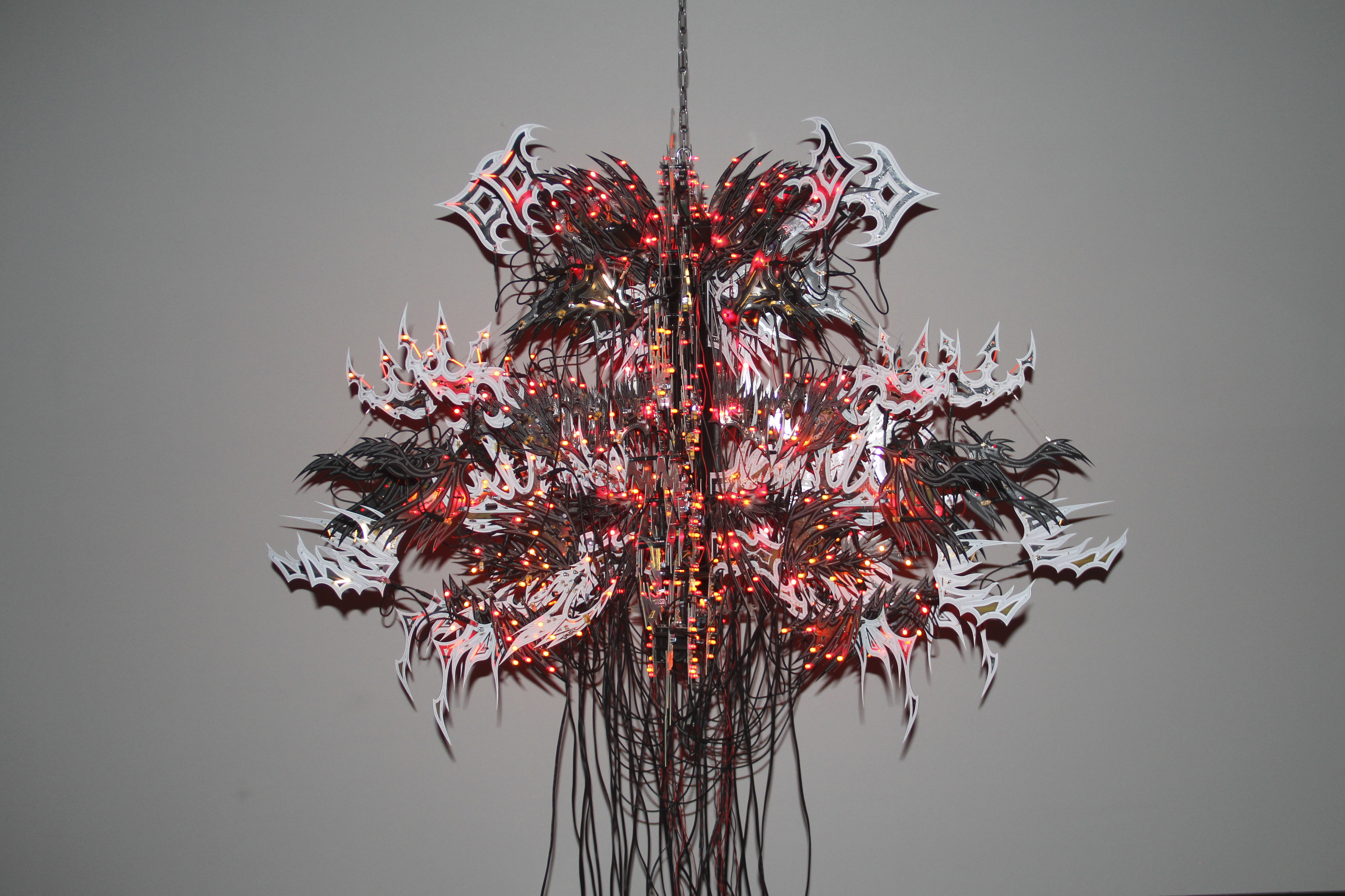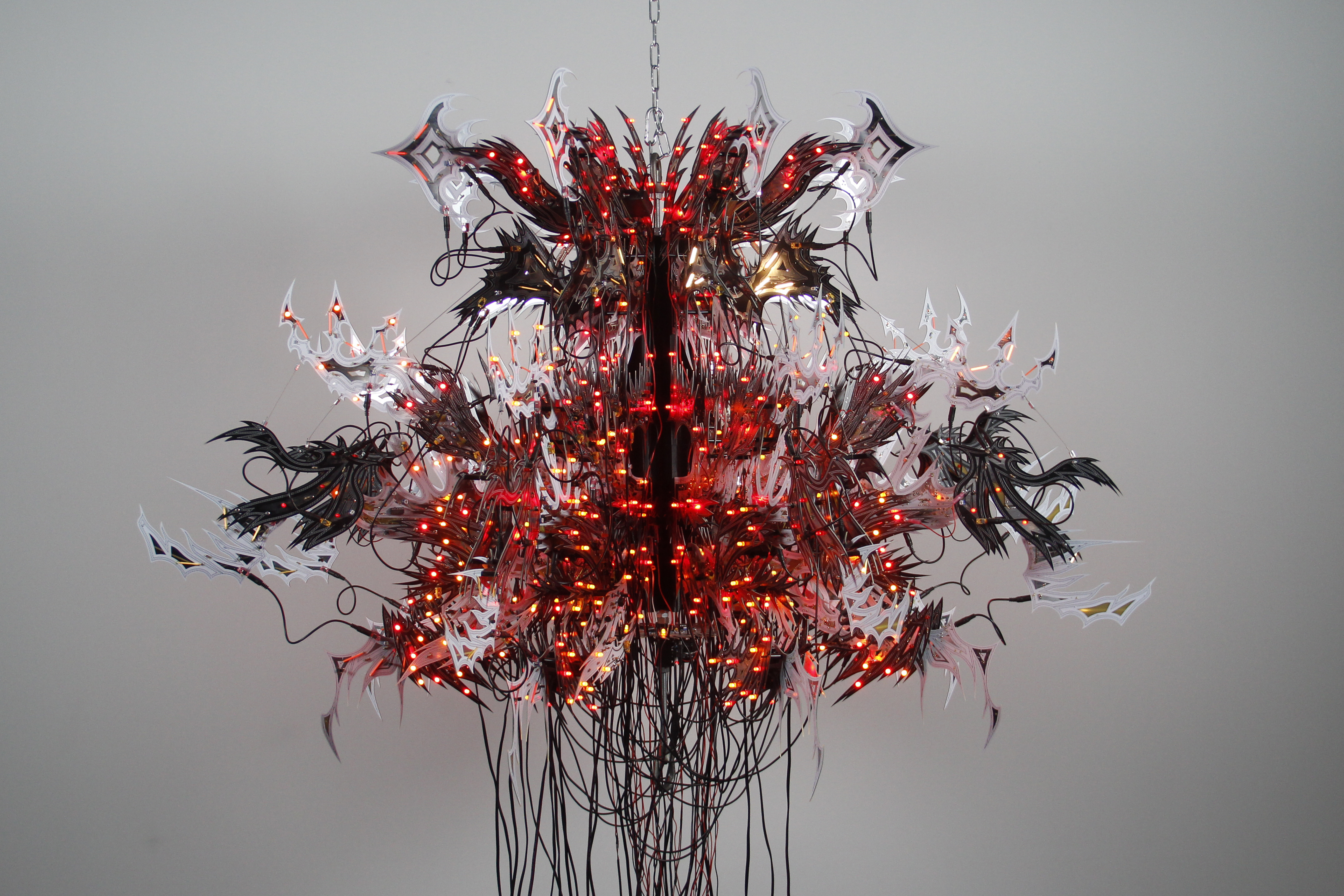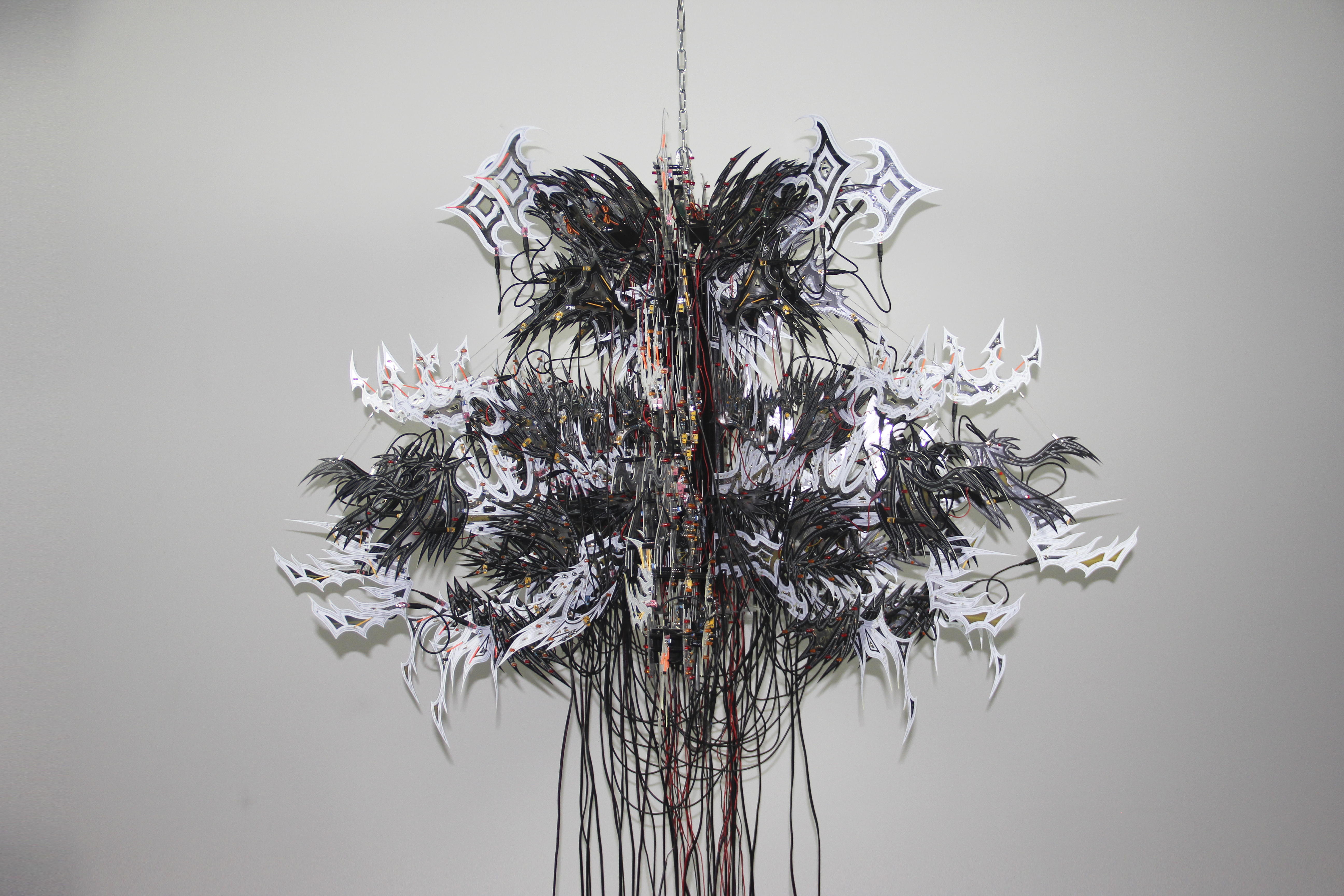 Vessel 1, 2022; 72 x 72 x 48in; Material: printed circuit boards, electronic components, microphones, audio cables, custom 3d printed hardware, power supplies, chain, miscellaneous hardware