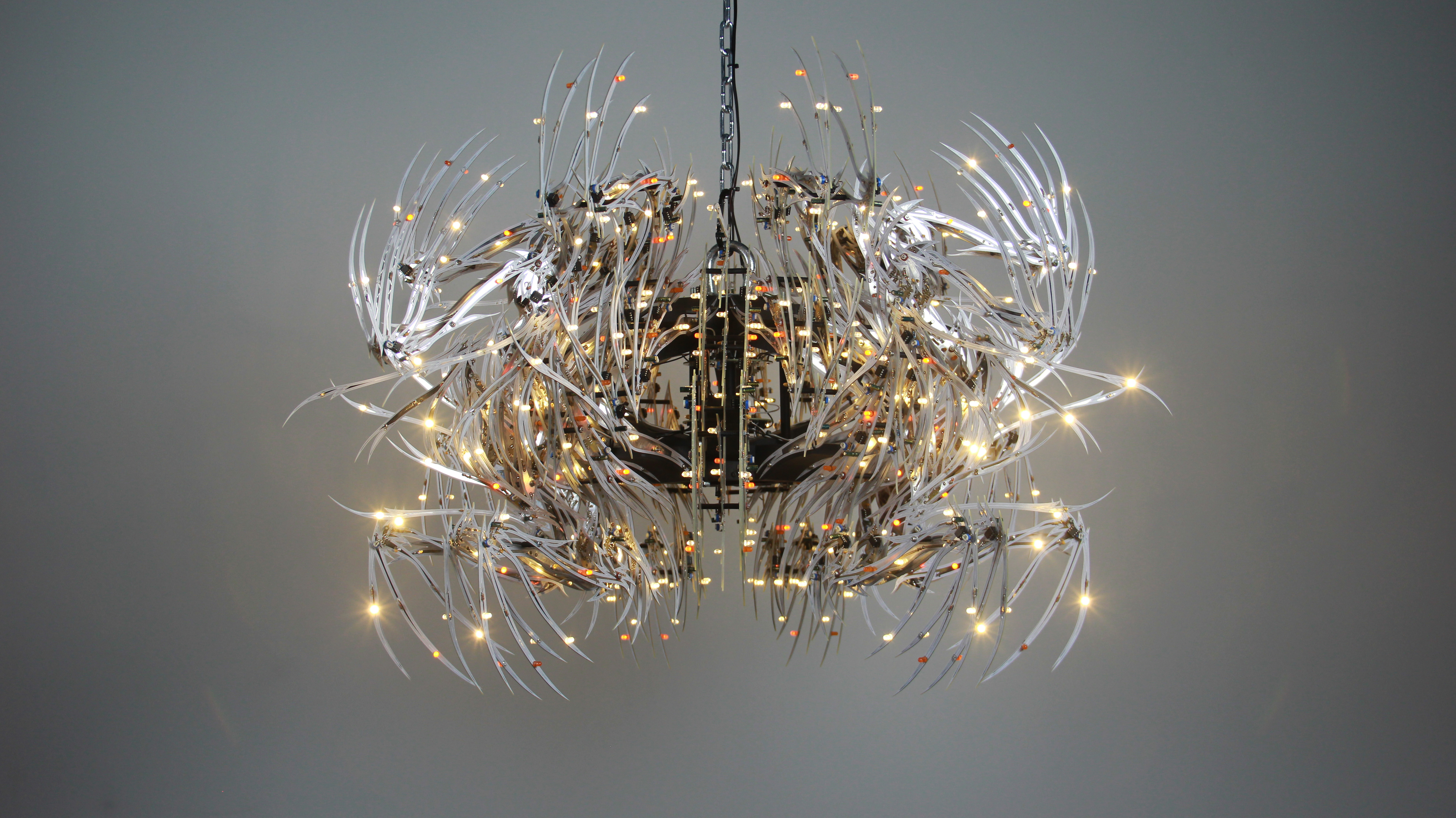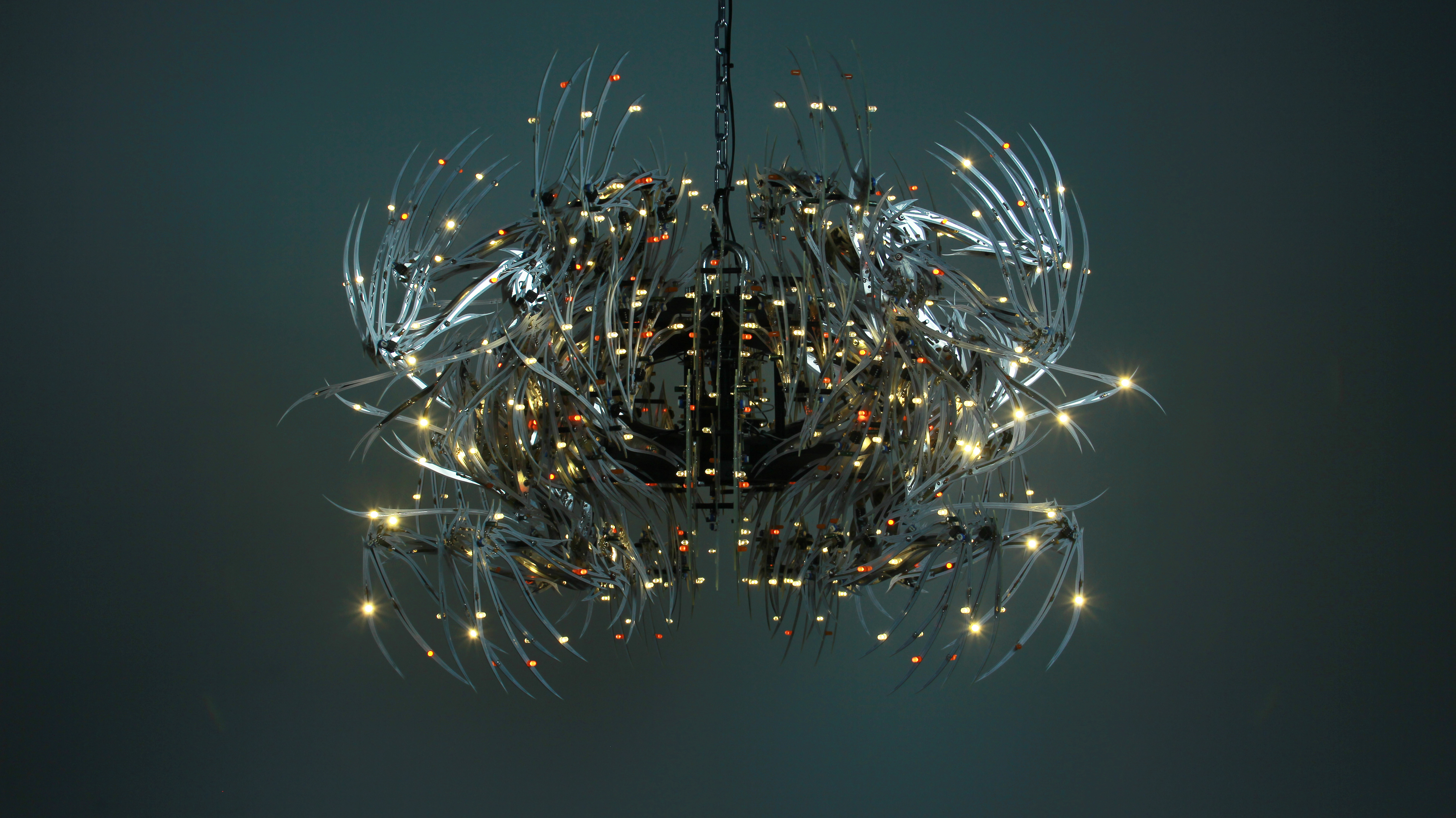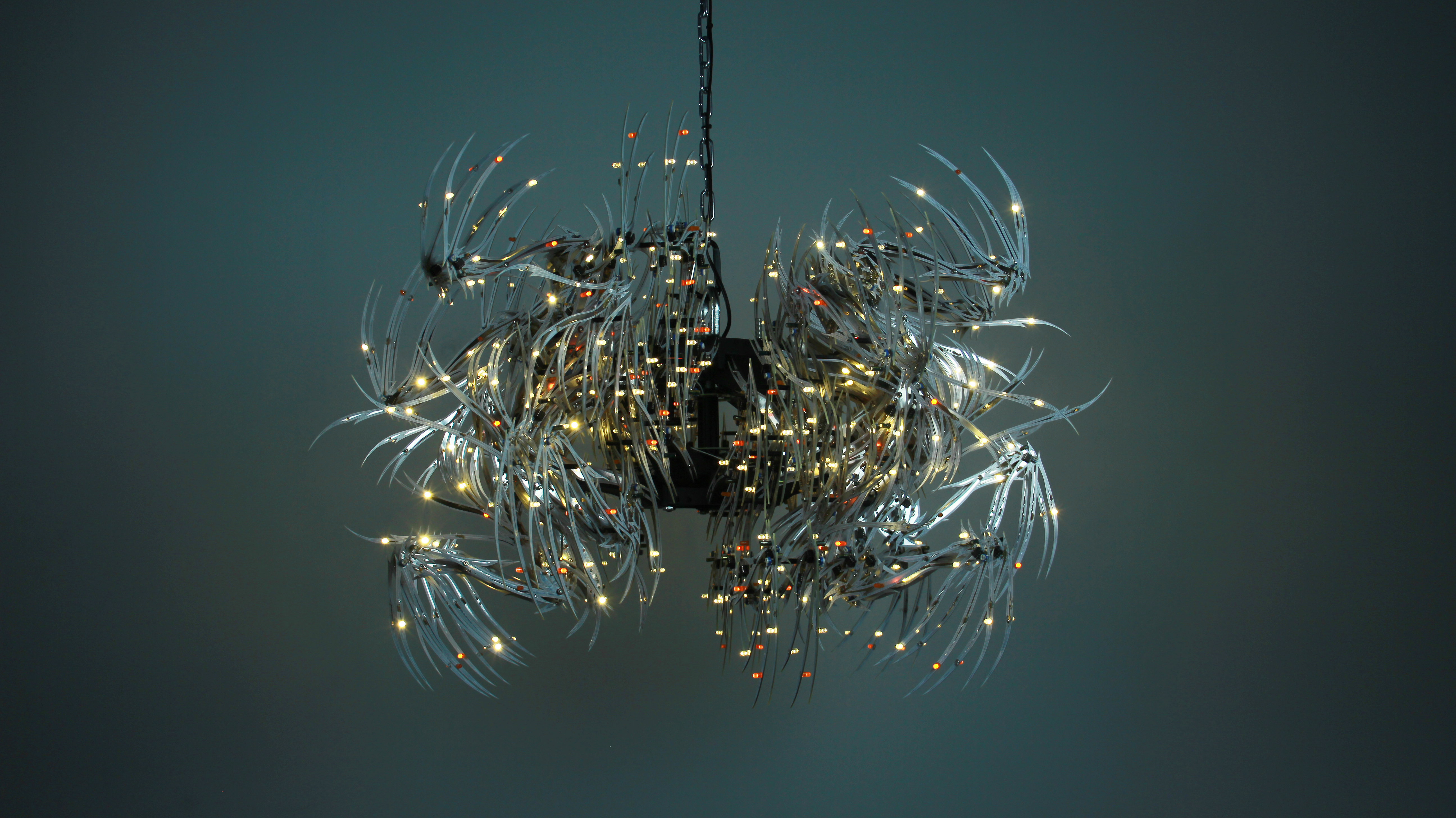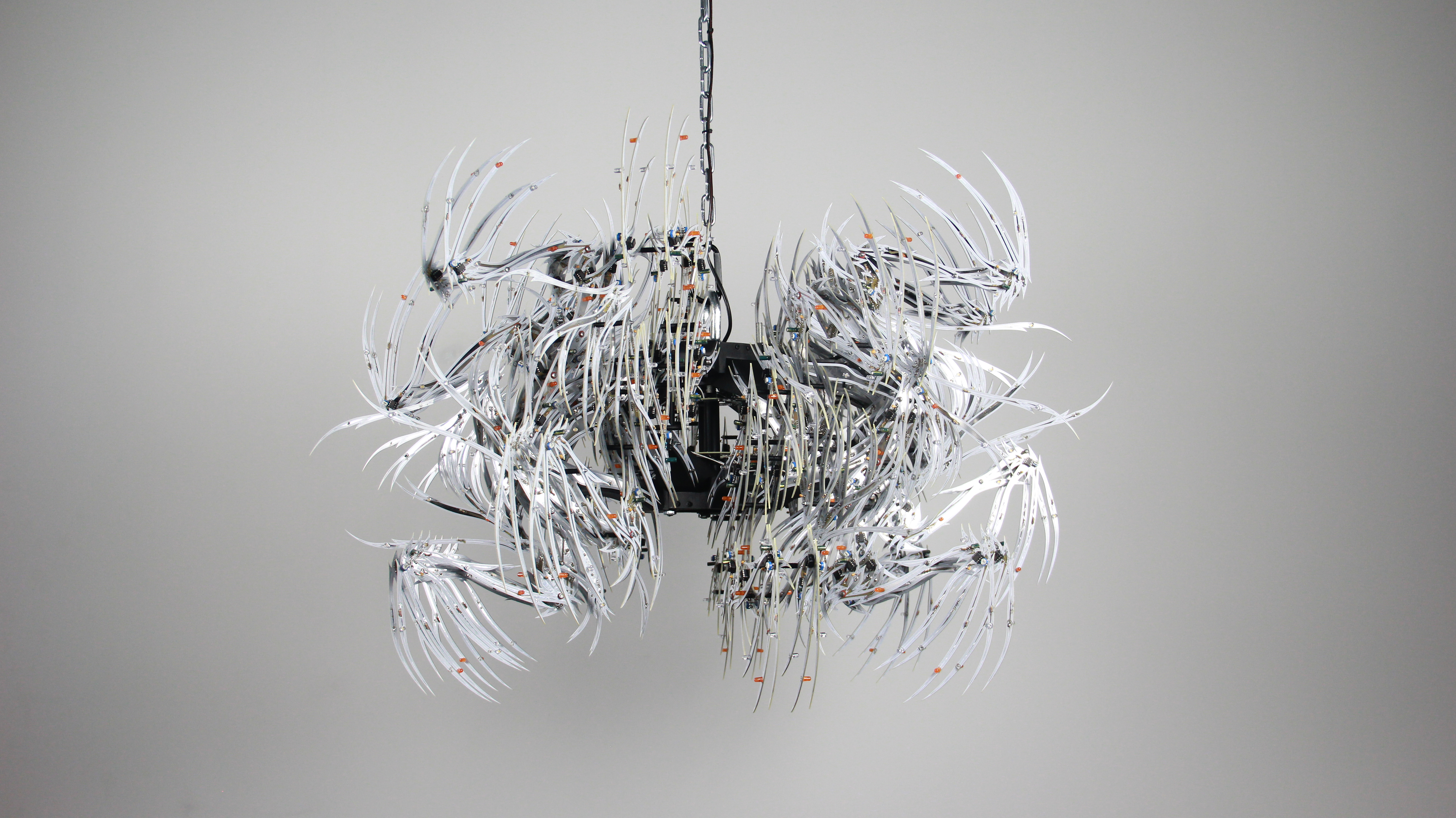 Vessel 5, 2025; 36in x 48in x 48in; Material: printed circuit boards, electronic components, signal cables, custom 3d printed hardware, power supplies, chain, miscellaneous hardware