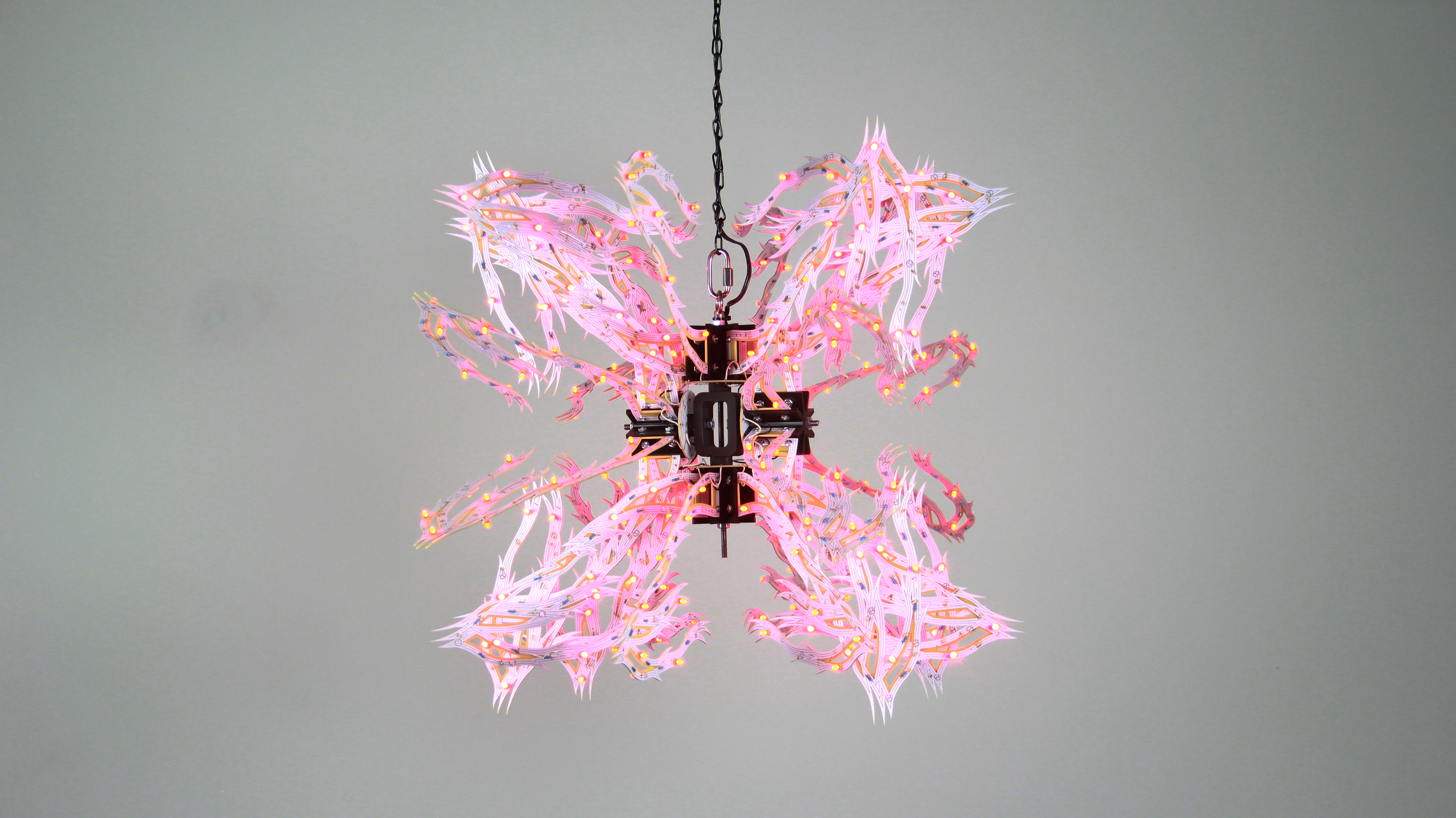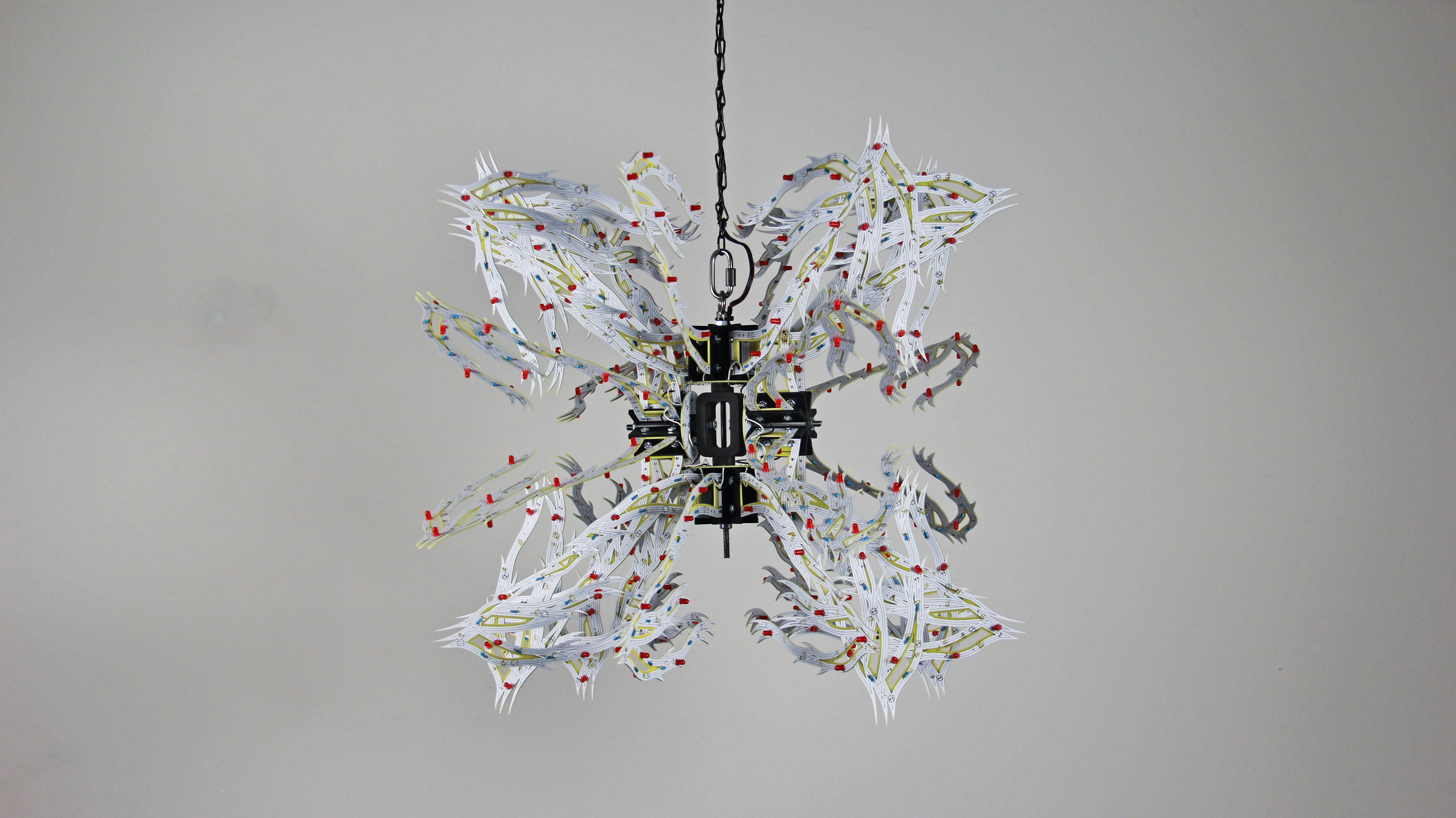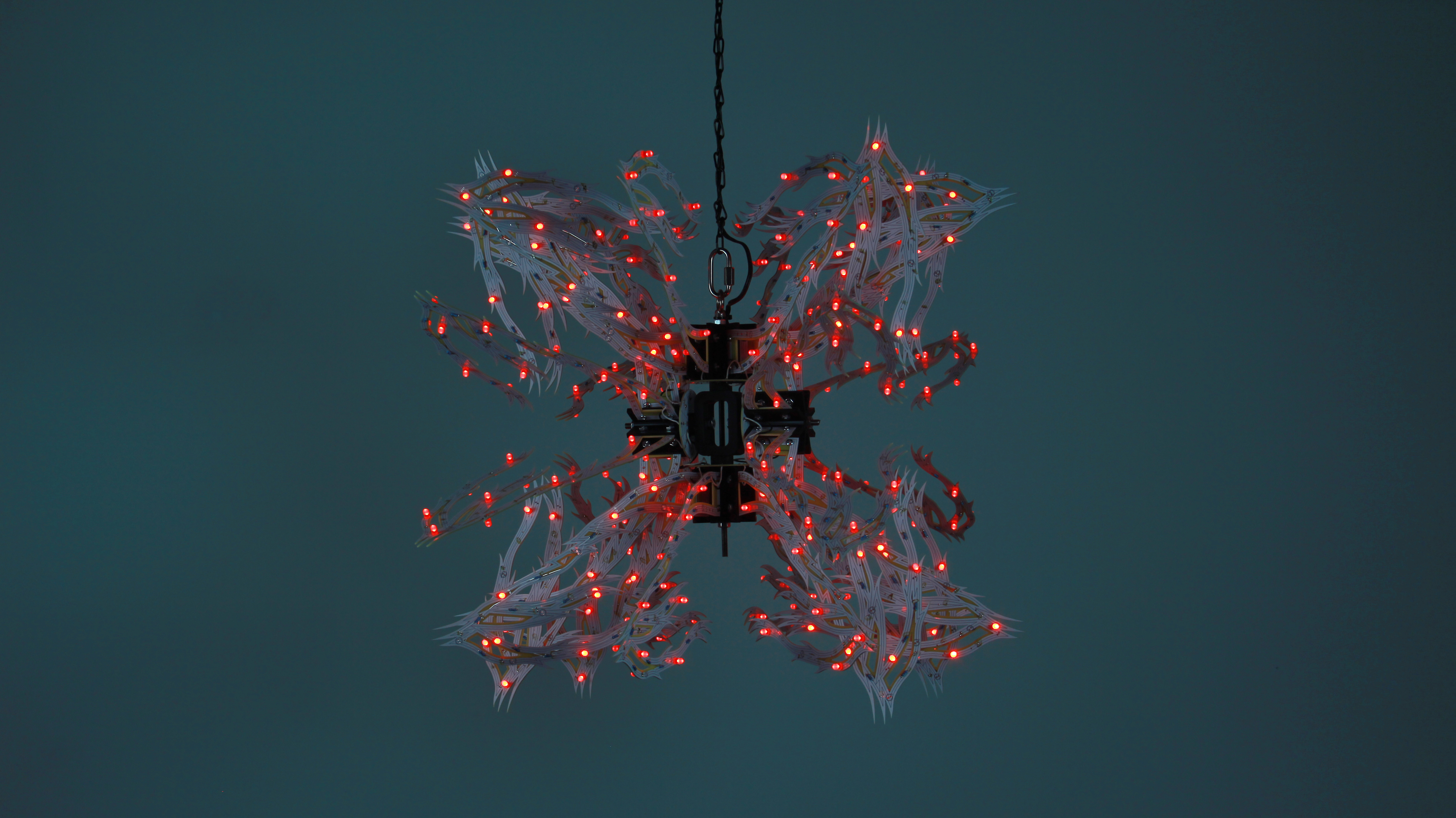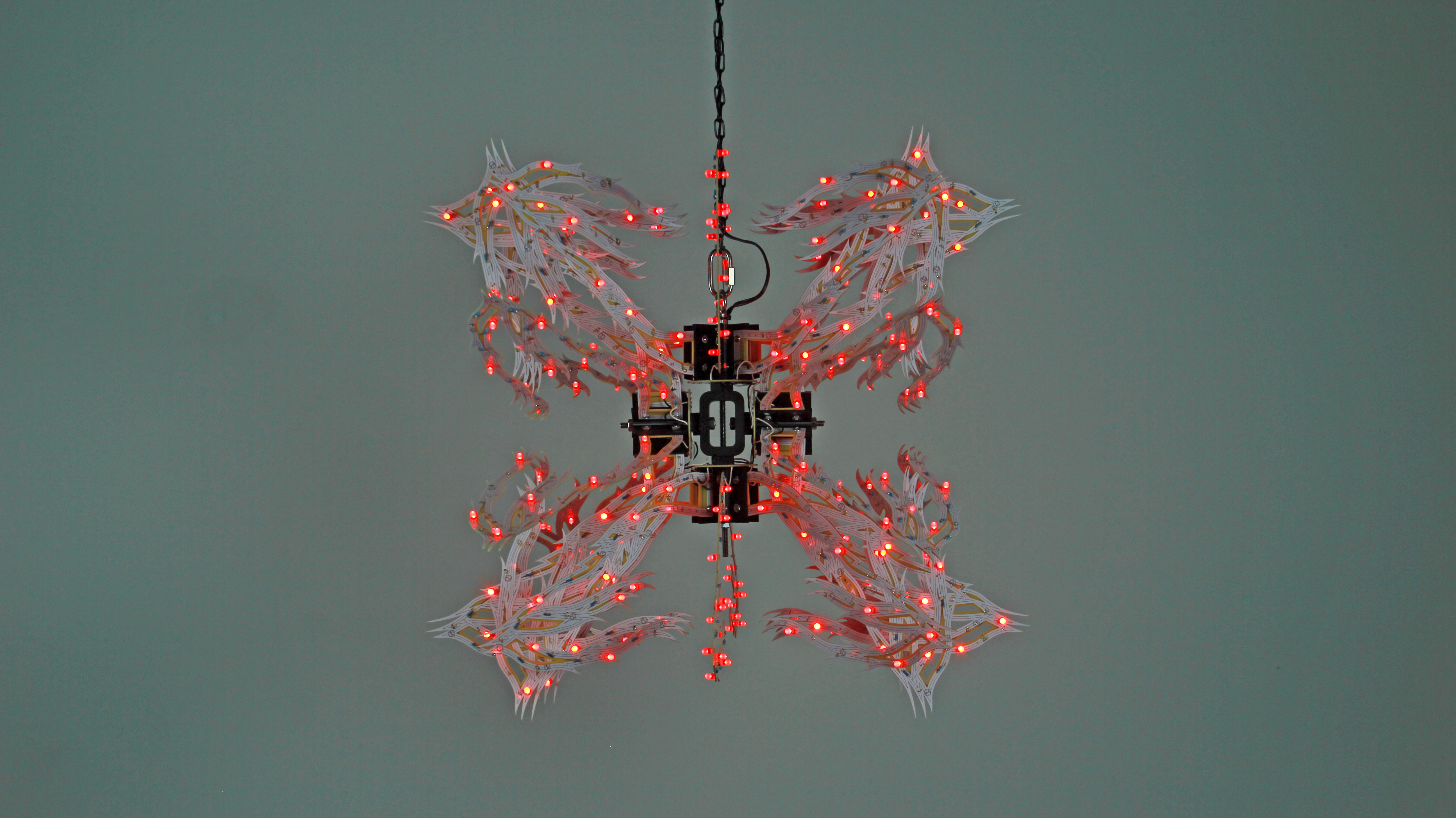 Vessel 6, 2025; 22in x 24in x 24in; Material: printed circuit boards, electronic components, power supply, chain, miscellaneous hardware