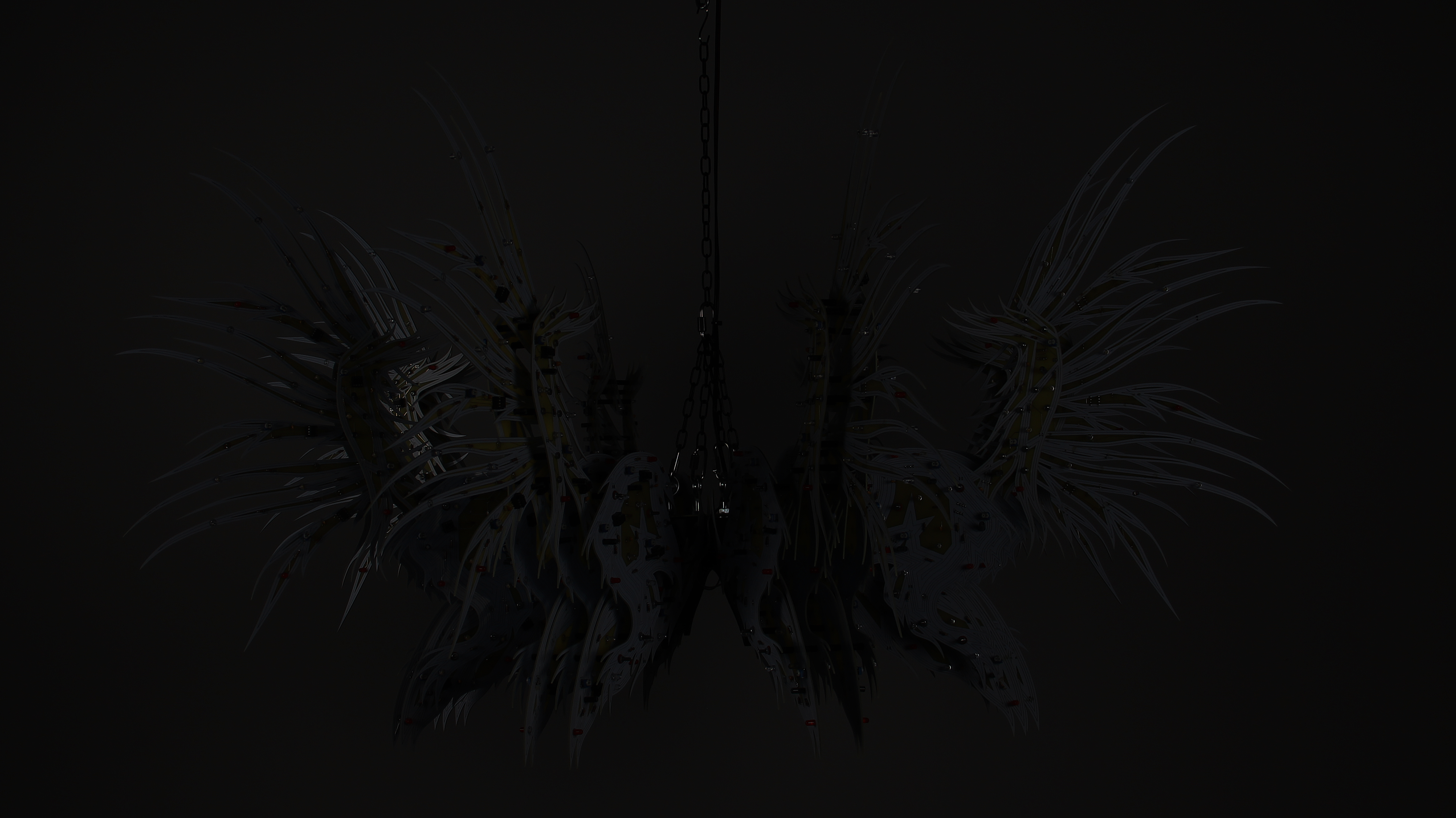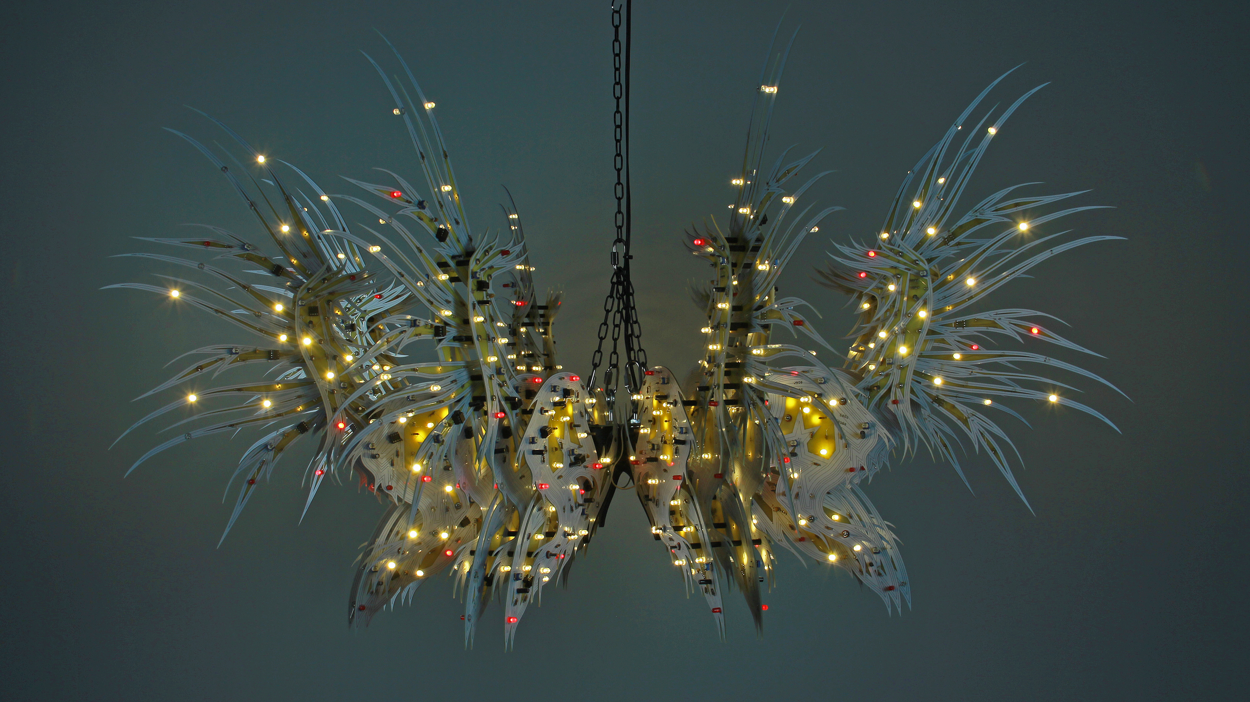 Vessel 9, 2025; 46” x 46” x 24”; Material: printed circuit boards, electronic components, power supply, chain, miscellaneous hardware